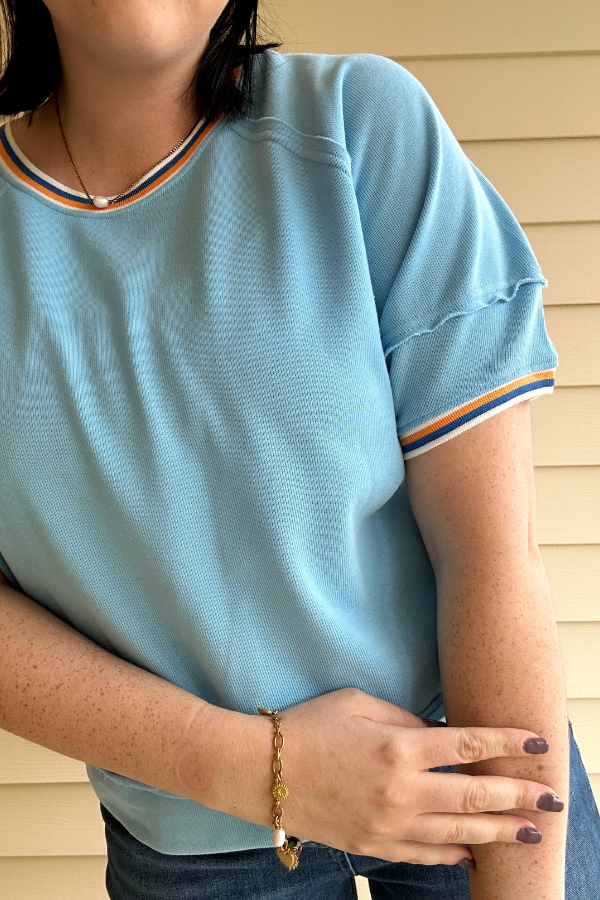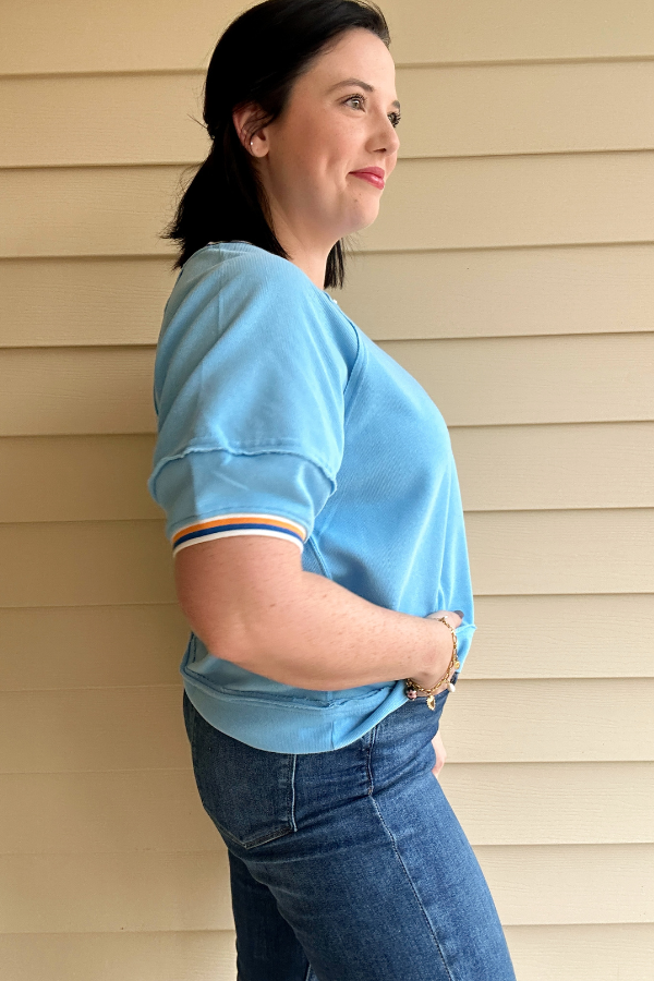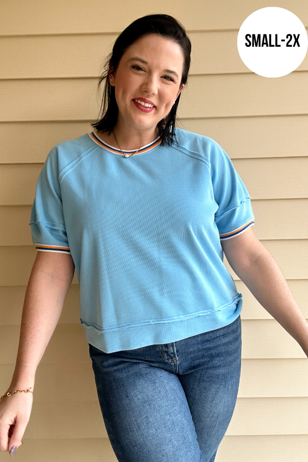 Final sale. Upgrade your casual wardrobe with this effortlessly stylish solid sweatshirt top. Designed for comfort and versatility, this top features a classic U-neckline and raglan short sleeves for a relaxed yet flattering fit. The striped trimming at the sleeve ends and neckline adds a sporty-chic touch, while the stitch seam edges provide subtle detail for a modern finish. Perfect for layering or wearing solo, this lightweight sweatshirt pairs effortlessly with jeans, leggings, or shorts for a laid-back yet polished look