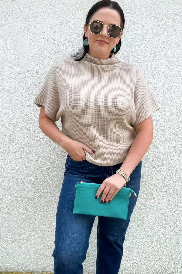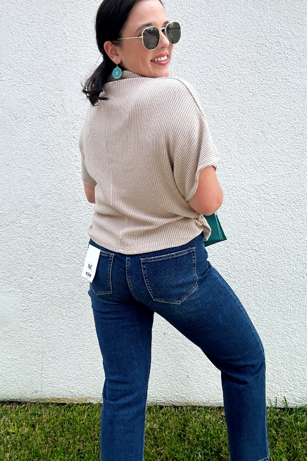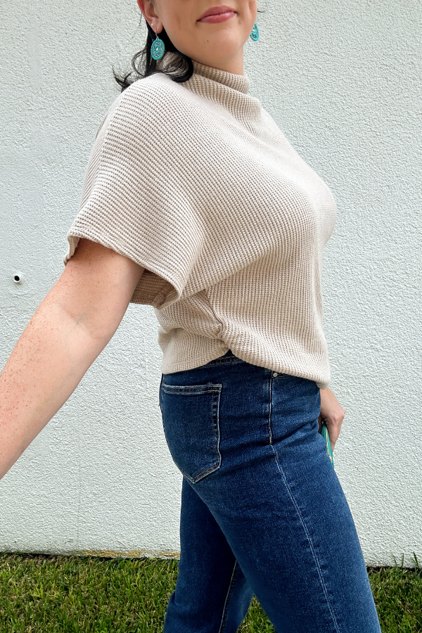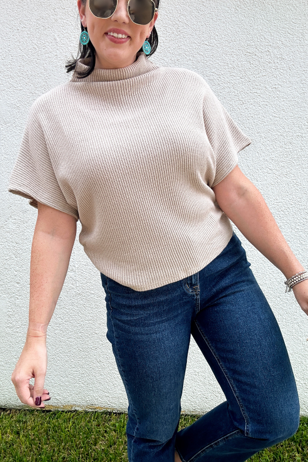 Winter sweaters too heavy? The Mock Up Sweater is the perfect solution for those in-between days. The lightweight knit is breathable, while the short sleeves and mock neck features keep you from over-heating. The shirred side adds a fun detail and makes the silhouette universally flattering.