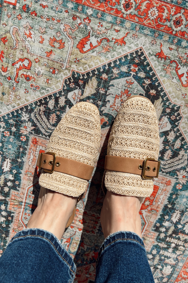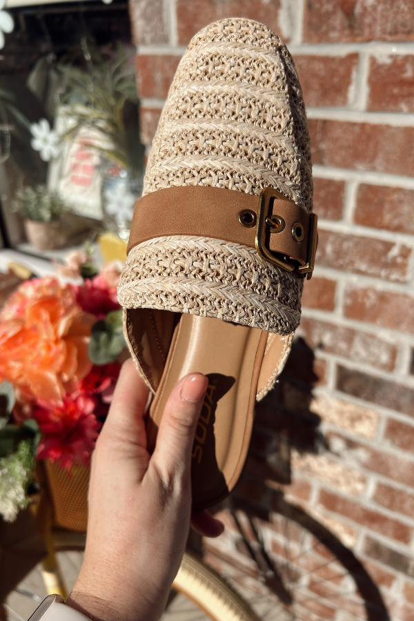 Final sale. Step right into sprint with these mules! An almond shape toe and a gold buckle detail make these slip-ons a classic shoe that you can wear year after year!
