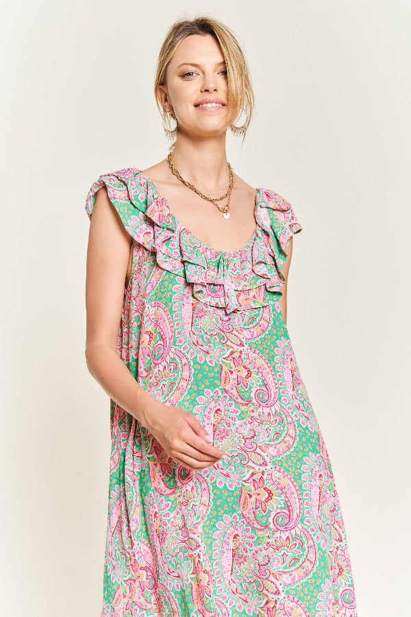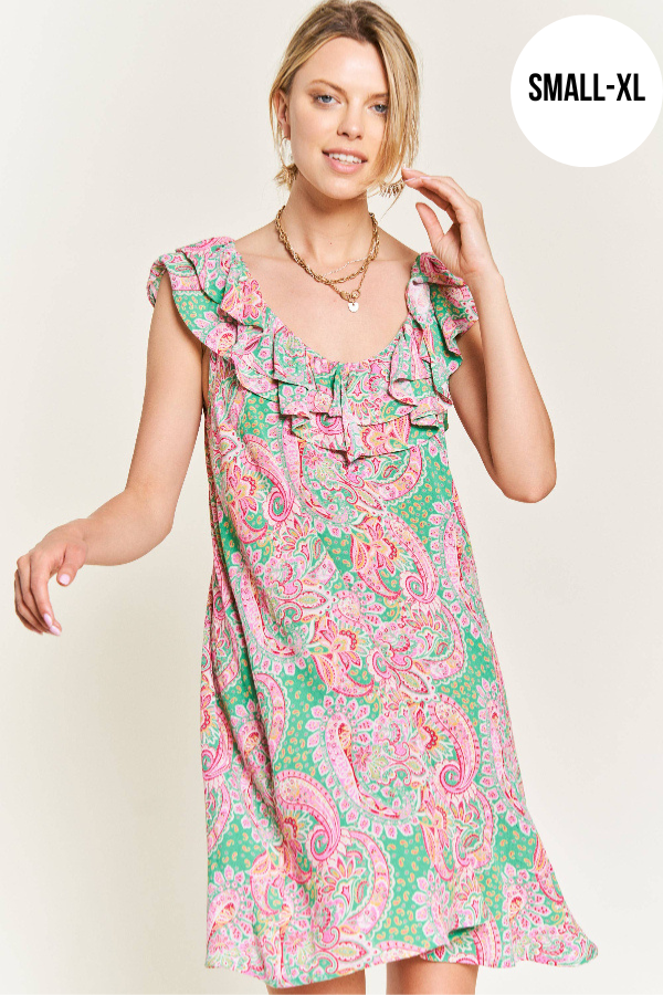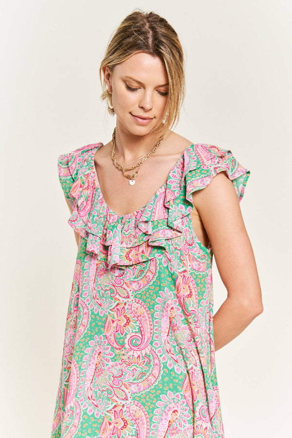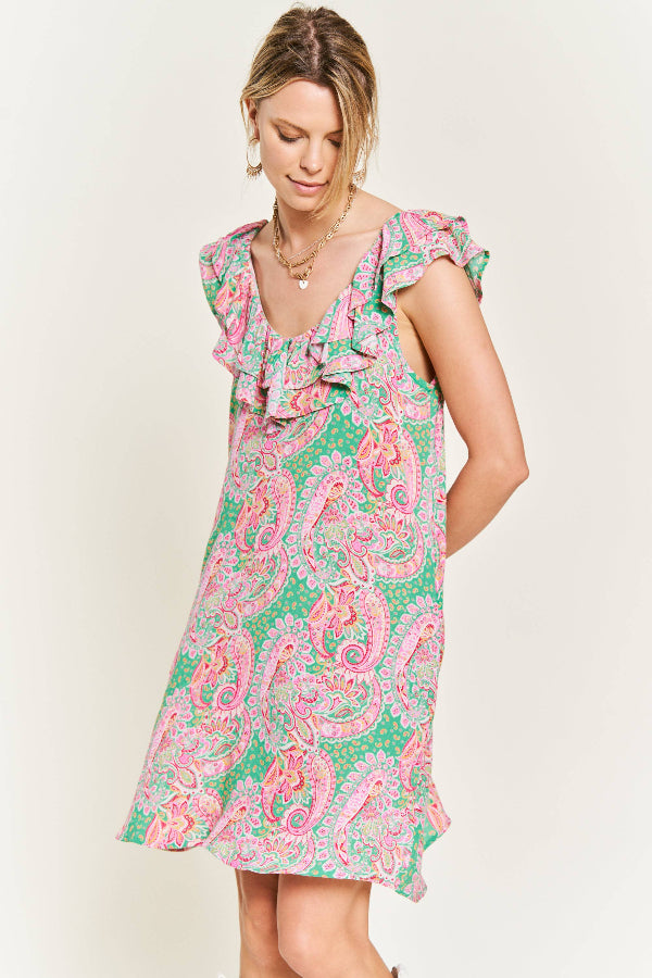 Final sale. Chic and breezy, this woven mini dress is perfect for spring and summer. Crafted from lightweight fabric, it features a deep round neck and back for an elegant touch. The ruffled shoulder trim adds a playful flair, while the flared silhouette offers a flattering, flowy fit. Ideal for warm-weather outings, this dress combines comfort and style effortlessly!