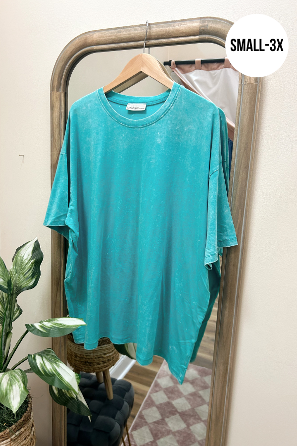 Our best-selling style! This over-sized, boxy tee is a turquoise, acid wash color featuring a drop shoulder. Perfect to pair with your favorite leggings or bike shorts! Finish the look with a fun necklace.