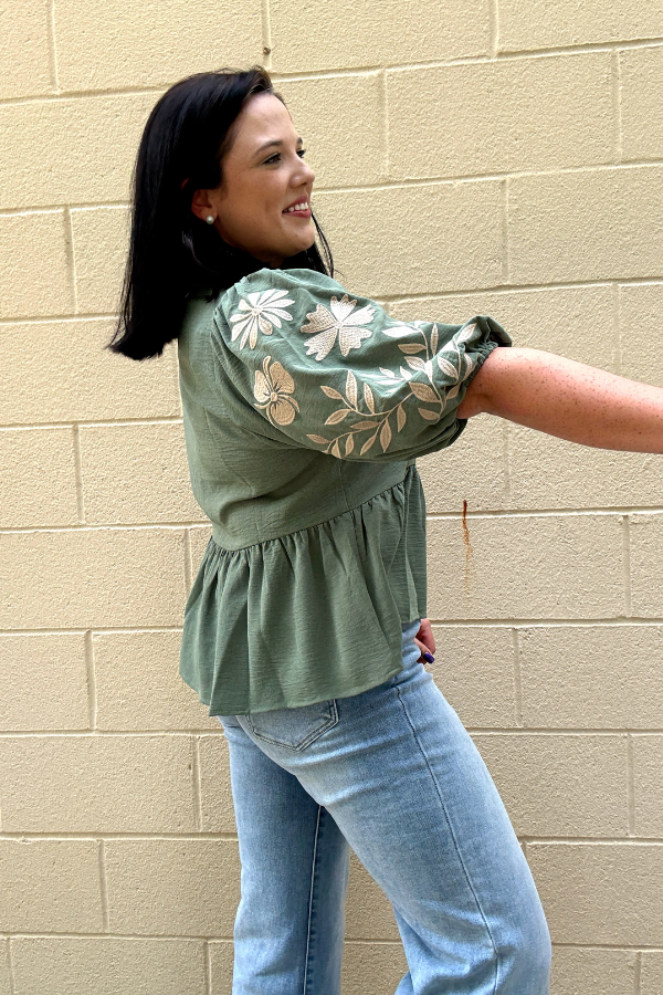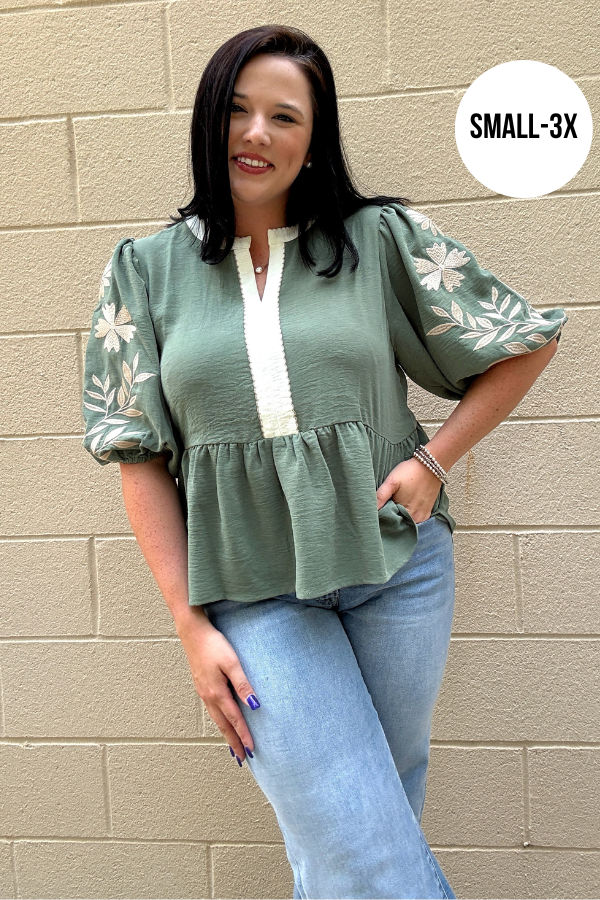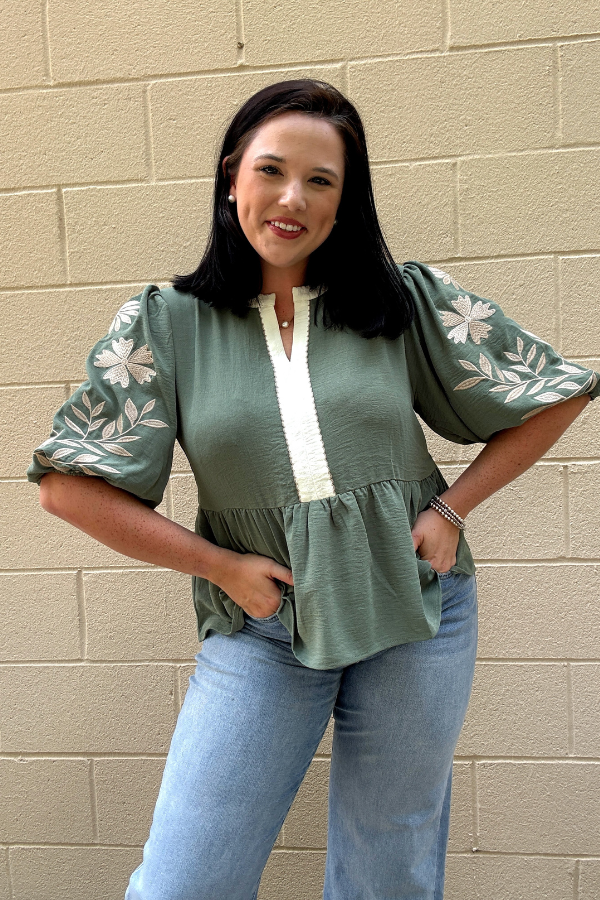 A breezy and feminine peplum blouse made from lightweight solid airflow fabric, featuring puffed 3/4 sleeves with delicate embroidery for a charming touch.