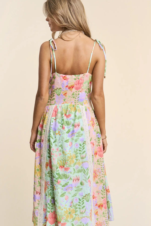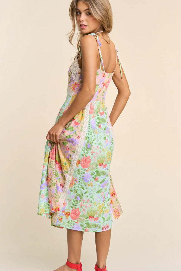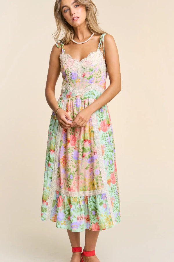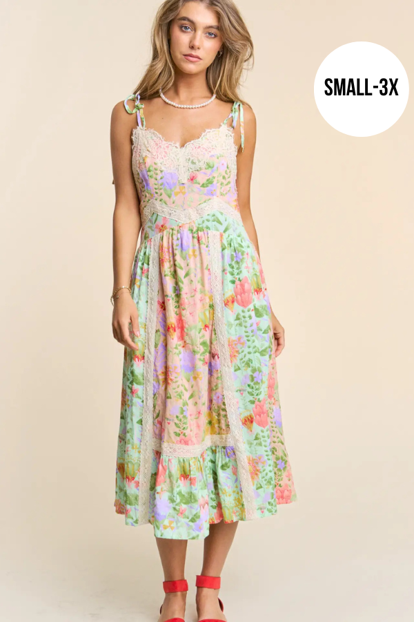 Fina sale, A playful and breezy Beauty Midi Dress that's perfect for sunny days and warm evenings. This women's spaghetti tie strap dress features delicate lace trim details and a gorgeous multicolor floral print that catches the eye. The tiered design adds movement and flair while you walk, creating a flattering silhouette for any body type. Easily dressed up with heels for a garden party or down with sandals for a casual brunch date. The adjustable straps ensure a comfortable, customized fit that works for you.
