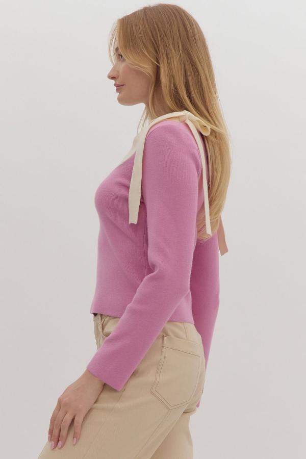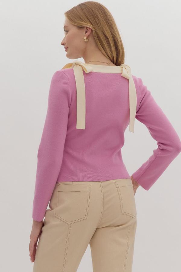 A fun twist on a classic! This midweight sweater features a rounded-square neckline and fixed ribbon detail.