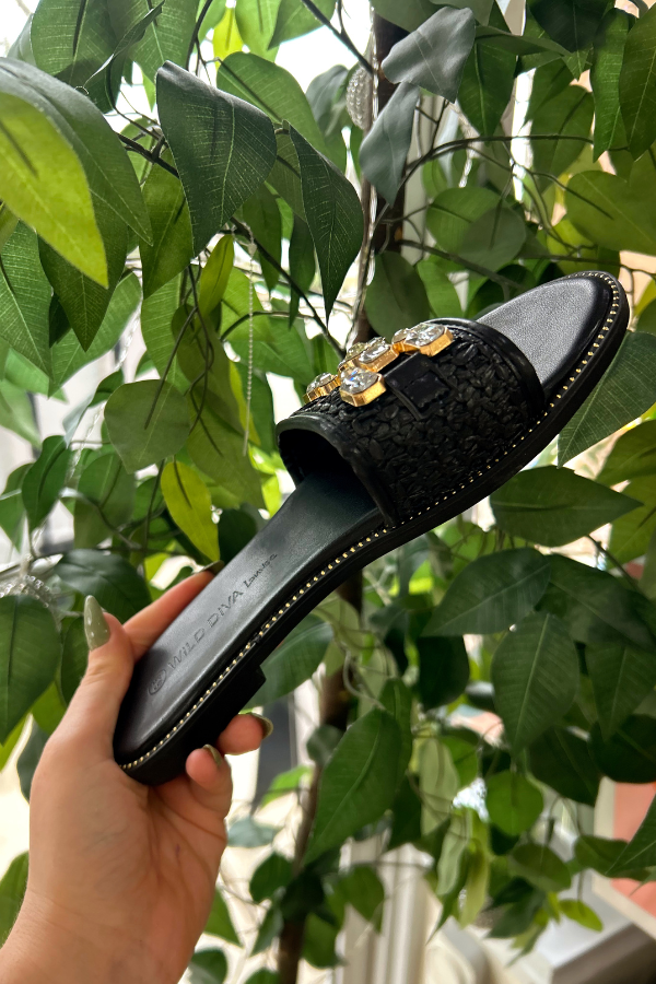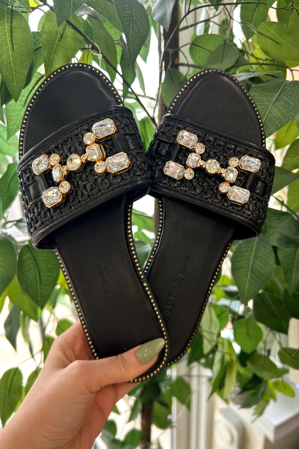 Final sale. Step up your style with these black raffia sandals, designed to add a touch of elegance to any outfit. Featuring a chic woven raffia upper, these sandals are adorned with a dazzling bedazzled link for the perfect hint of sparkle. Small gold studs accent the sole, adding a subtle yet luxe detail. With a comfortable fit and effortless slip-on design, these sandals are perfect for everything from casual days to evening outings. Pair them with your favorite summer dress or denim for an elevated look with ease.
