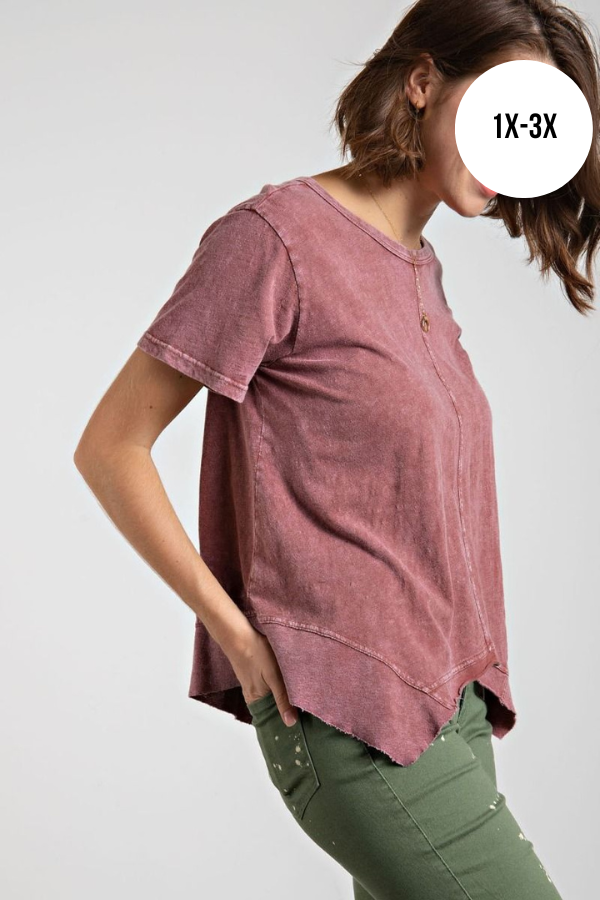 This top features a rounded neckline, visible seams, a shark bite hem, and a mineral-washed finish for a relaxed, worn-in look.