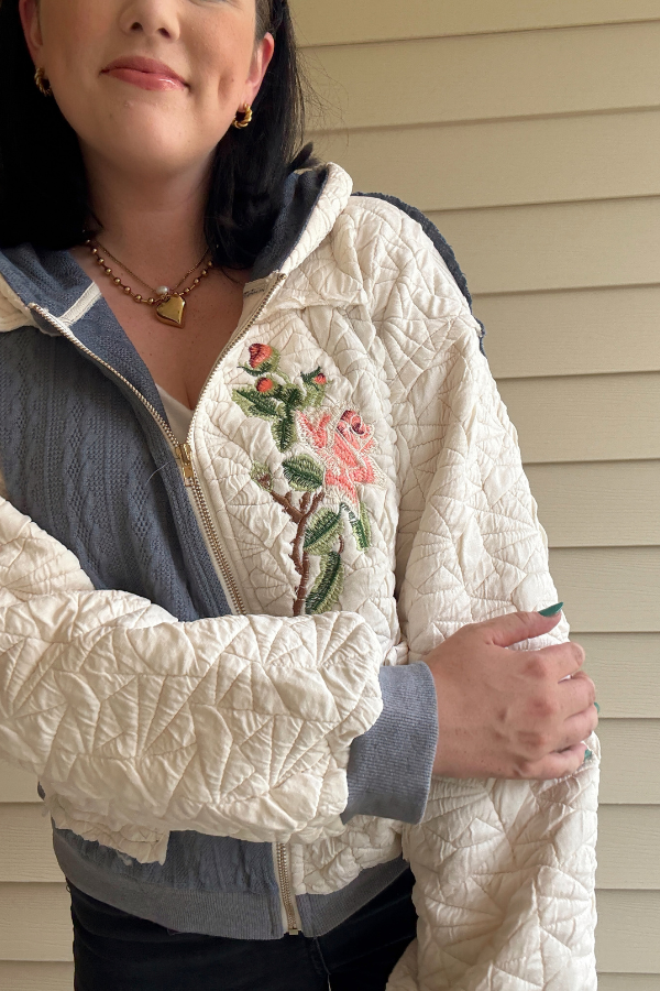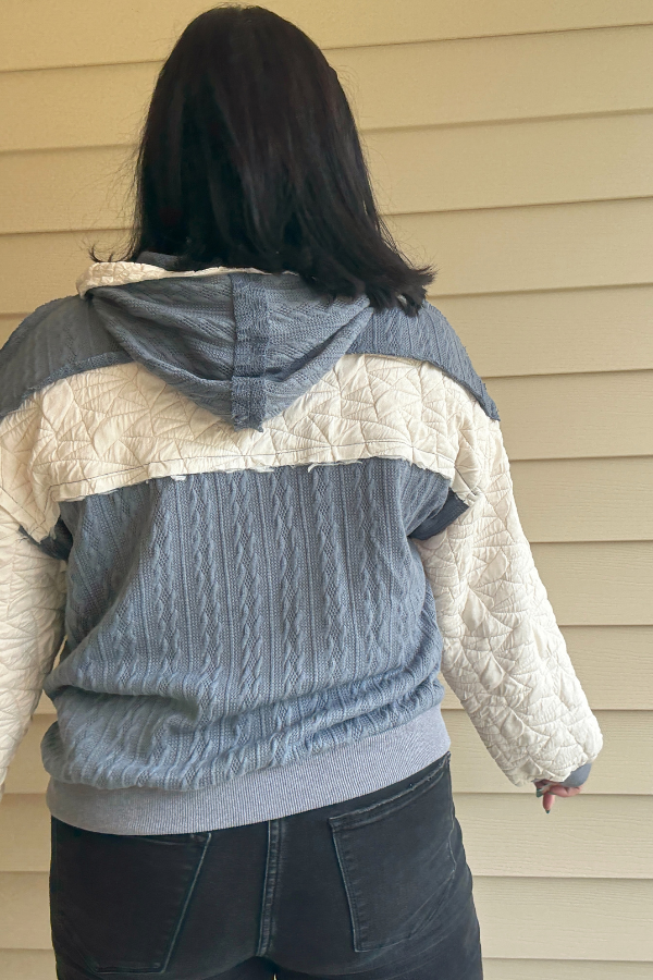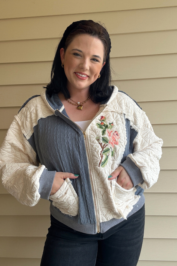 Stay cozy in this quilted long sleeve hoodie jacket, featuring embroidery accents, cut-and-sew patches, front pockets, and color-blocked sleeve bands. Finished with vintage washing for a soft, worn-in feel.