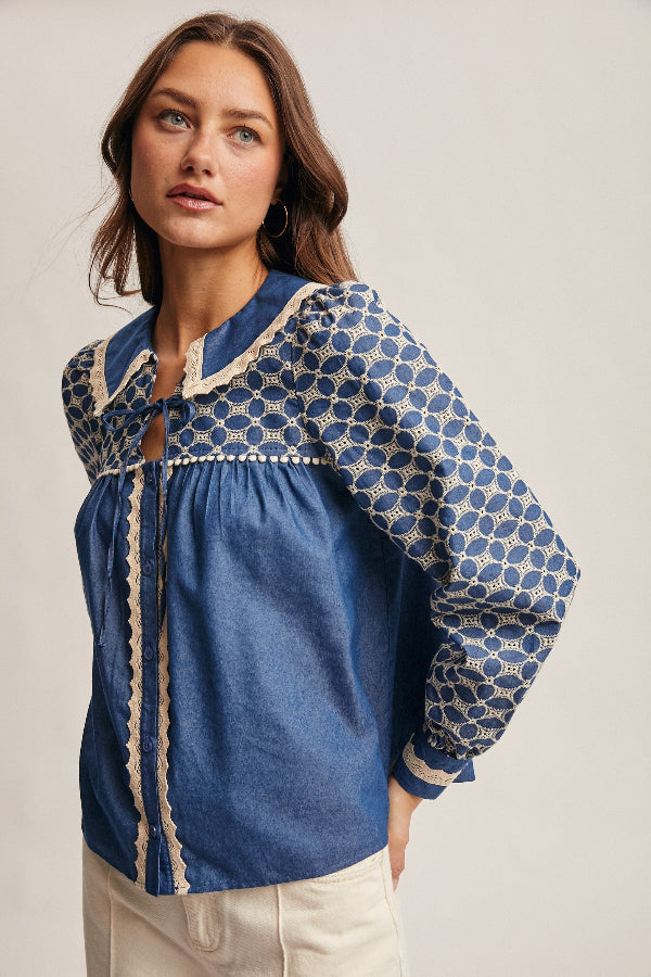 This top features soft, breathable cotton denim for a comfortable, everyday feel. Vintage-inspired circular lace embroidery adorns the sleeves and yoke, while ivory scalloped lace trims the button placket, collar, and cuffs for a feminine touch. The Peter Pan collar with lace edges and a tie neck adds a playful vibe. With a button-down front, gathered bodice, and elasticized cuffs on lightly puffed sleeves, it offers an easy, relaxed fit perfect for casual wear.