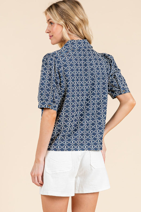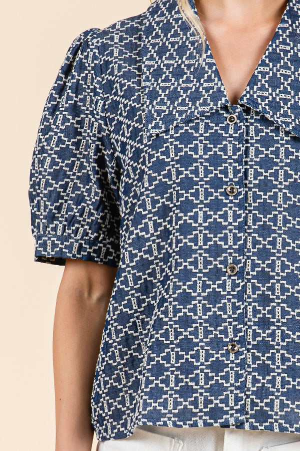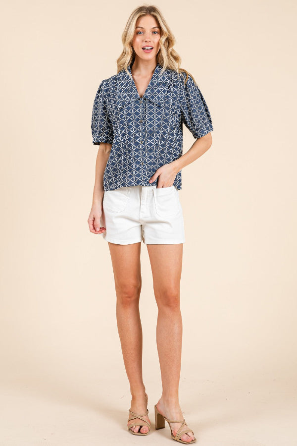 This casual button-up top features embroidery, a lining for comfort, a wide collar, and half-length sleeves.