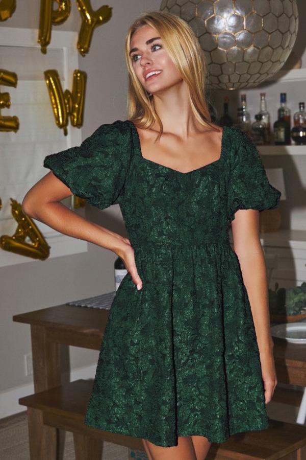 The perfect holiday dress to make a statement for every winter occasion! This satin jacquard, bubble sleeve, baby doll dress is universally flattering in both fit and color!