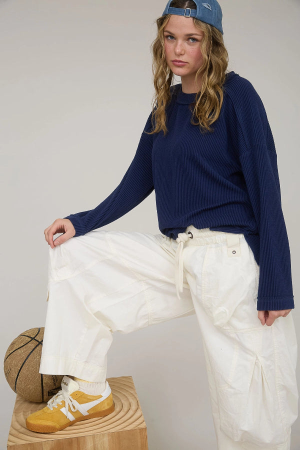 This casual knit top features a crew neckline with a ribbed pattern and long sleeves. It includes an extended shoulder design, exposed seams, and raw edge details for a relaxed, effortless look. Made with a comfortable, unlined fabric, this round-neck ribbed top is perfect for everyday wear.