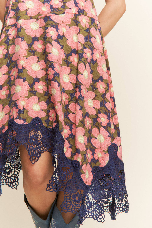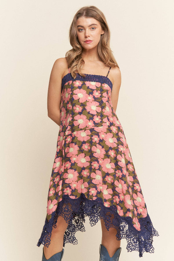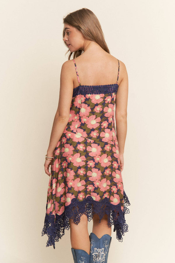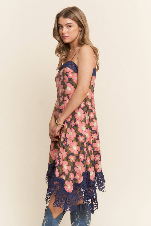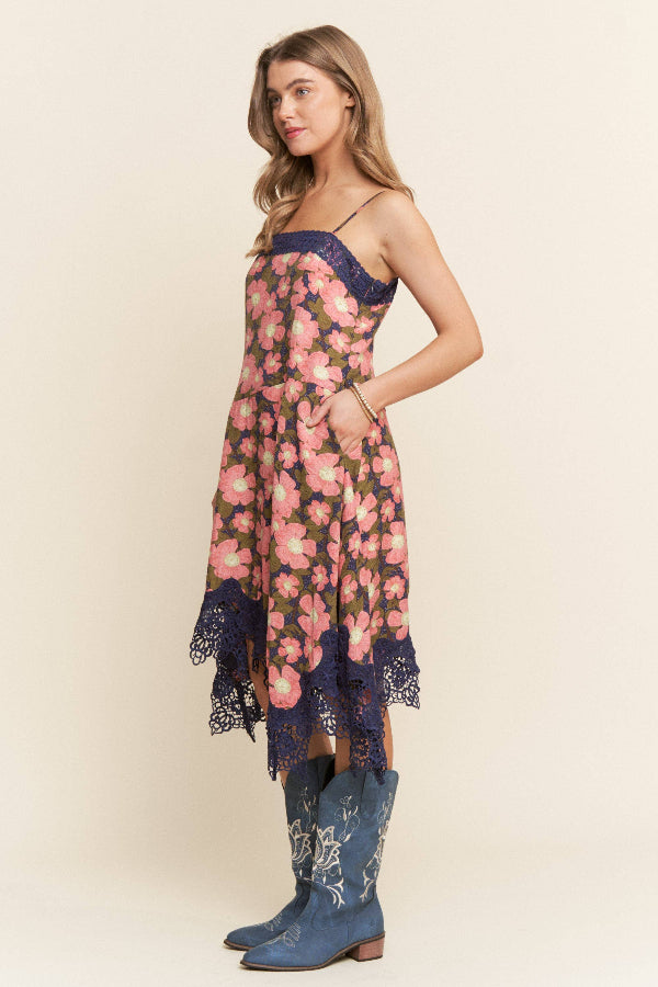 This Floral Print Lace Trim Midi Dress combines feminine charm with practical details for everyday wear. Featuring a delicate lace trim along the pointed hem, it adds a subtle touch of elegance to the vibrant floral pattern. Designed with convenient pockets, this dress lets you carry essentials hands-free. Adjustable spaghetti straps ensure a comfortable, customized fit, making it perfect for casual outings or relaxed gatherings. Its midi length offers a flattering silhouette that moves gracefully with you throughout the day. Embrace effortless style and comfort in this versatile wardrobe staple.