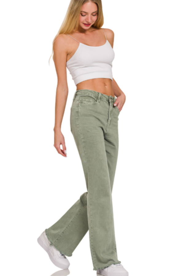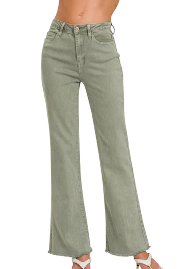 Our best-selling style is here in a FULL LENGTH version! Revamp your wardrobe with the stylish and comfortable Back at it Pants- Olive These high-waisted bootcut pants feature a unique acid wash and frayed hem details, bringing an edgy and modern touch to any outfit. Not only do they look great, but they also provide a flattering fit and maximum comfort for all-day wear.