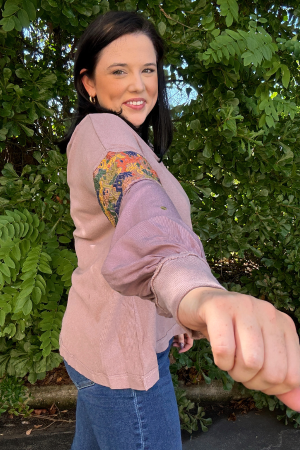 This long sleeve tee stands out with its contrasting sleeves, geometric embroidery, and raw hem details. Perfect for casual wear during the fall and winter seasons!