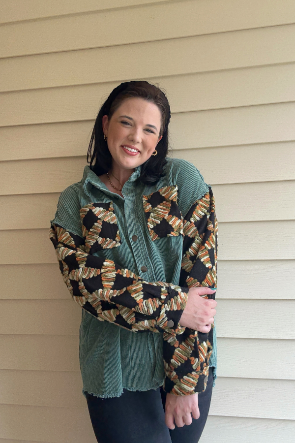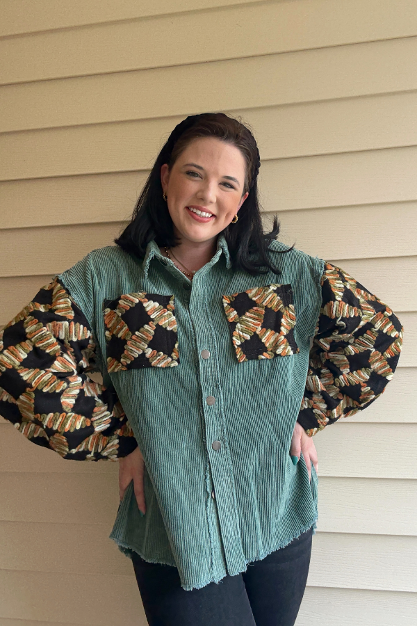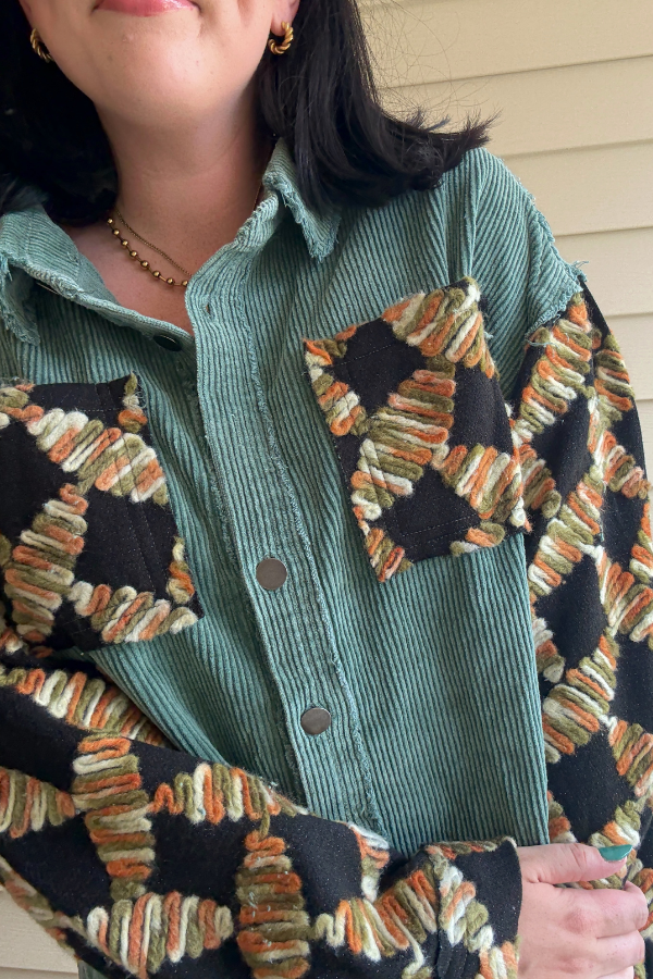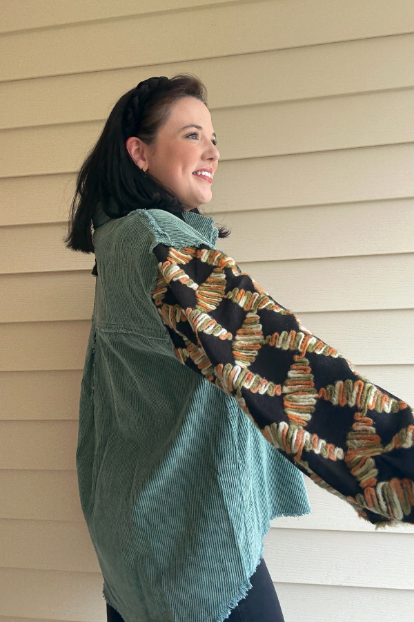 This long sleeve corduroy shacket features a regular fit with raglan textured knit patches, outseam and raw edge details, and vintage washing. Finished in a mix of solid and check patterns for a laid-back, lived-in look.
