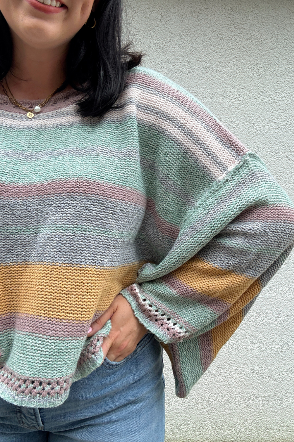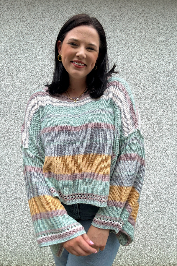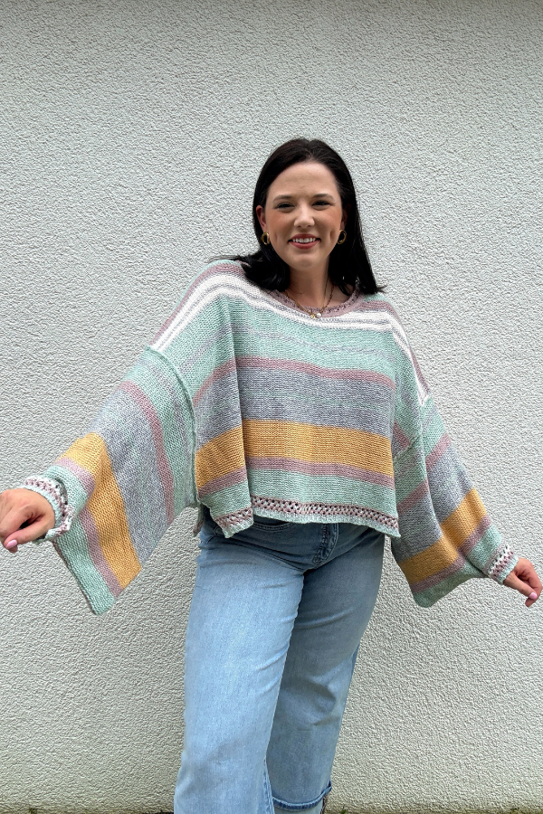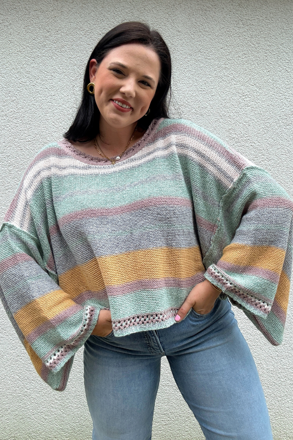 The Hop to It Sweater is a stylish, lightweight knit sweater designed for everyday comfort. Its cropped fit pairs perfectly with high-waisted jeans or skirts, while the playful striped pattern adds a touch of fun to your outfit. Featuring bell sleeves, this sweater brings a relaxed, casual vibe that’s great for layering or wearing on warmer days.