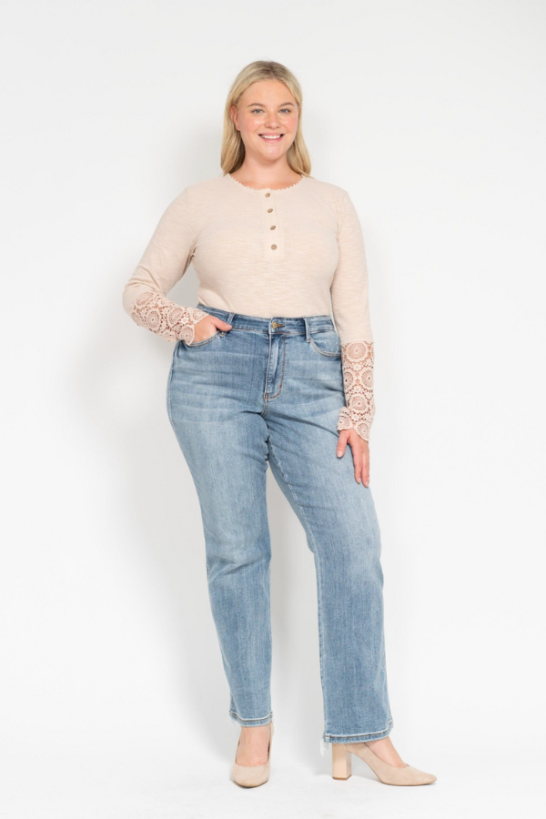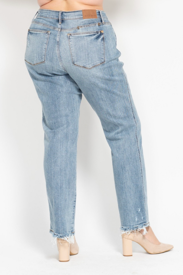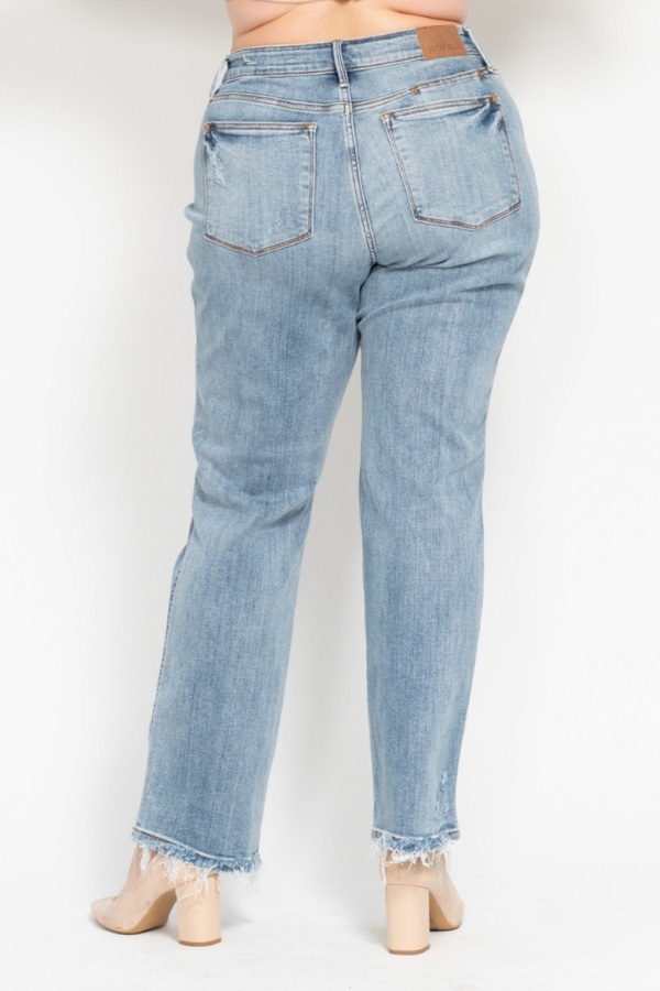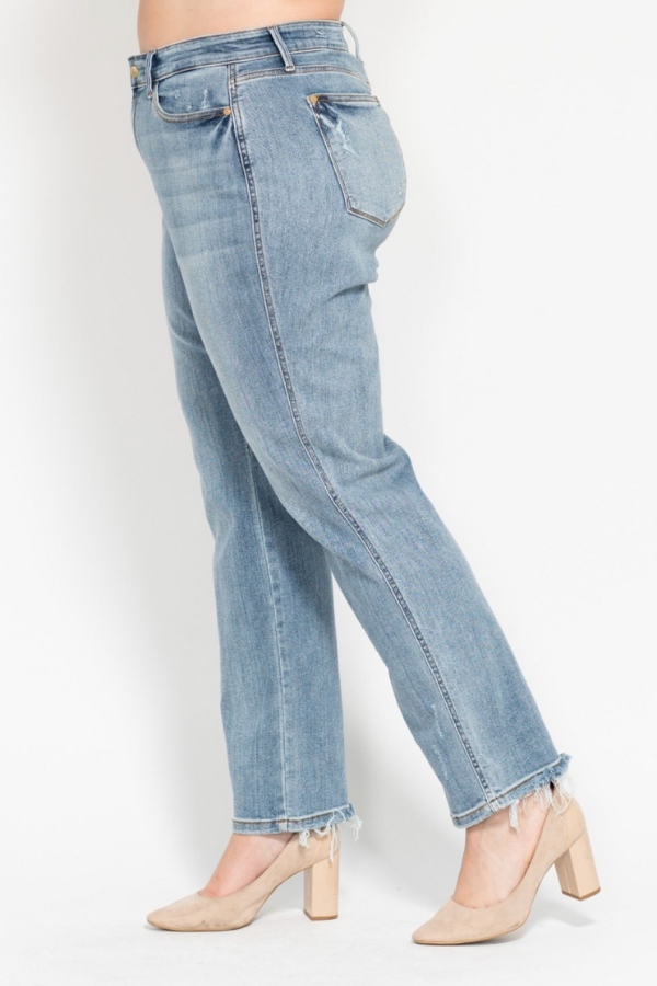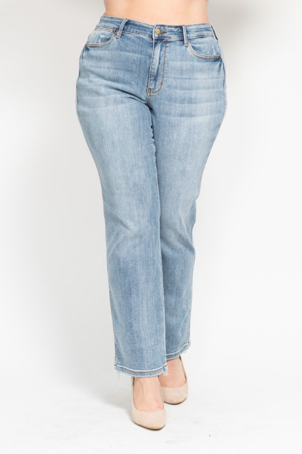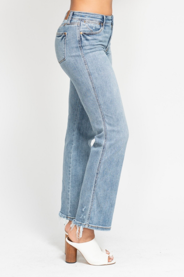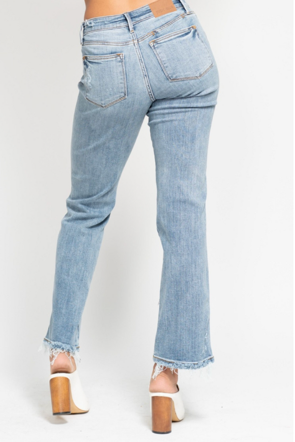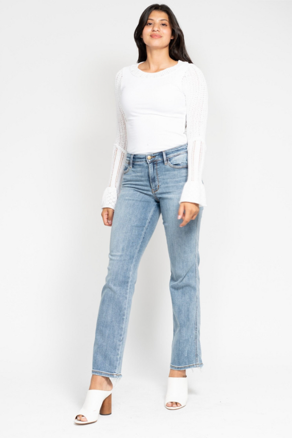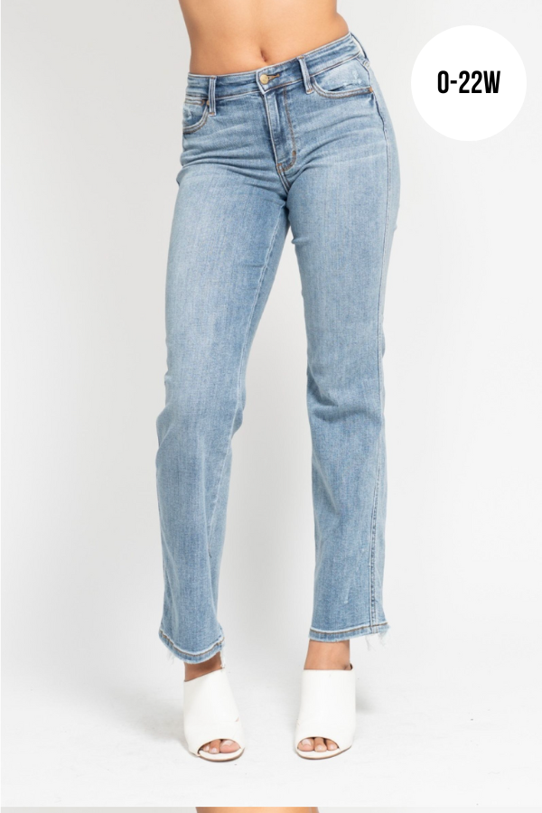 A fun take on straight leg jeans! These Judy Blue Jeans are a mid-rise, light wash style! Minimal distress on the hems!