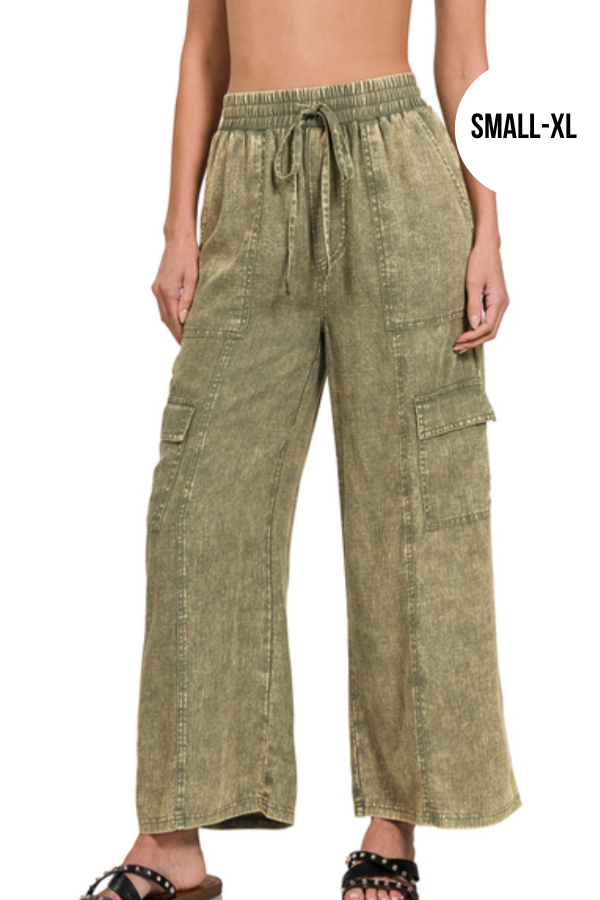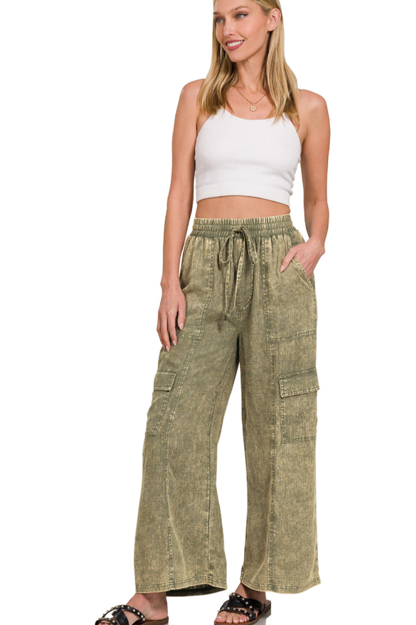 These washed linen cargo pants feature a comfortable elastic waistband and come with four flap cargo pockets on the sides and back, plus two additional side pockets for extra storage.
