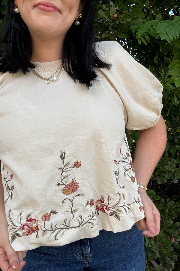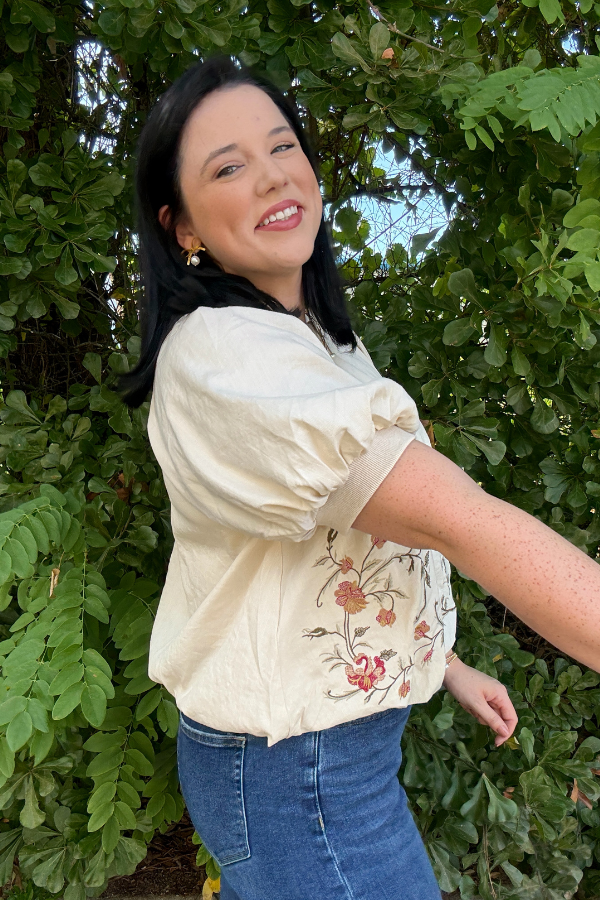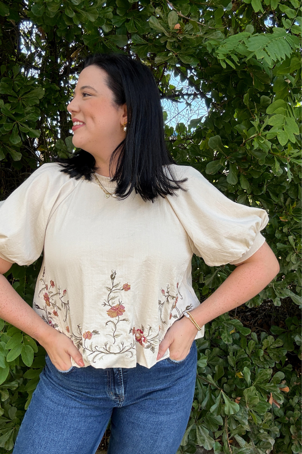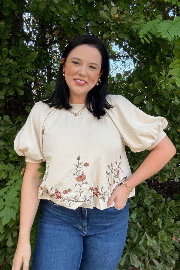 The Little Touch Top is a charming raglan short puff sleeve blouse designed to add a delicate flair to your everyday wardrobe. Crafted from lightweight woven fabric, this non-sheer top feels comfortable and breathable all day long. It features beautiful floral embroidery along the hem, adding a subtle yet stylish detail. The lined interior ensures smooth wear, while the button closure at the back provides an easy and secure fit. Perfect for pairing with jeans or skirts, this top effortlessly blends casual comfort with a touch of elegance.