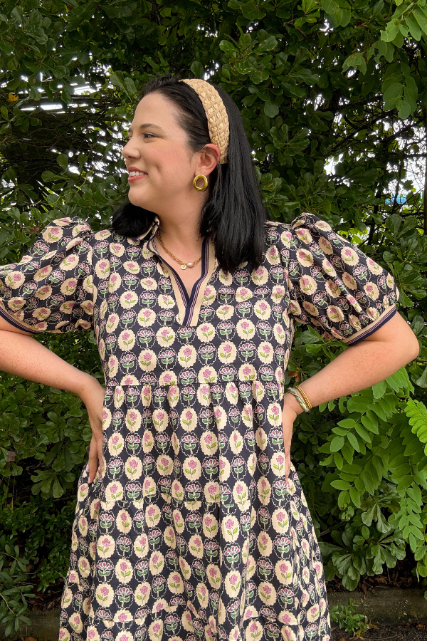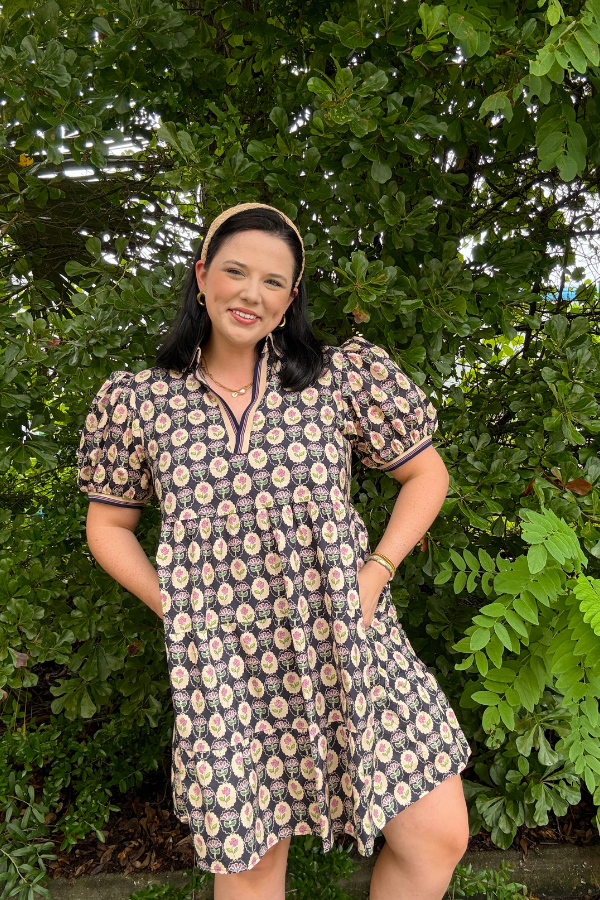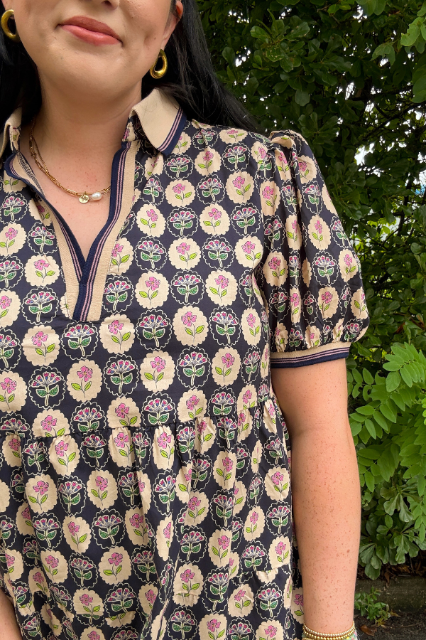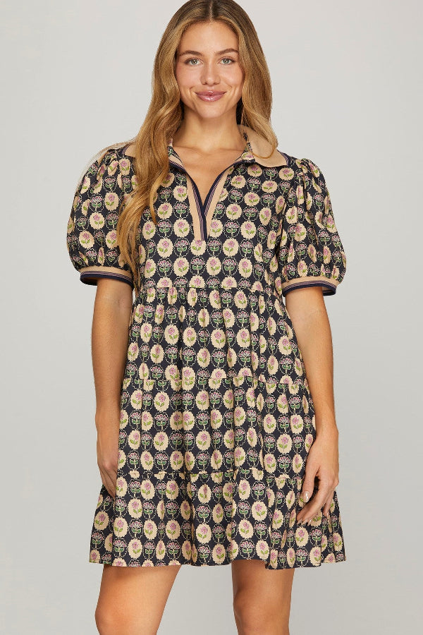 This mini dress features puff sleeves, a ribbed band collar, and a printed woven fabric. It has a tiered design and convenient side pockets for a relaxed, stylish look.