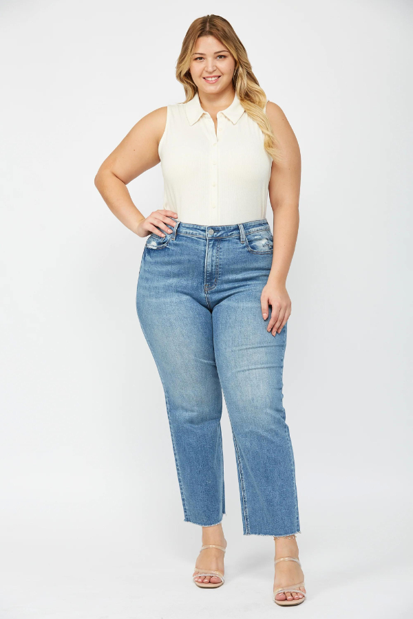 * BEST SELLER* Mica Denim offers the ultimate in elevated style with their High Rise Straight Leg, featuring a playful Step Hem. Elevate your fashion game with this jean staple that offers the perfect amount of stretch! Dark wash