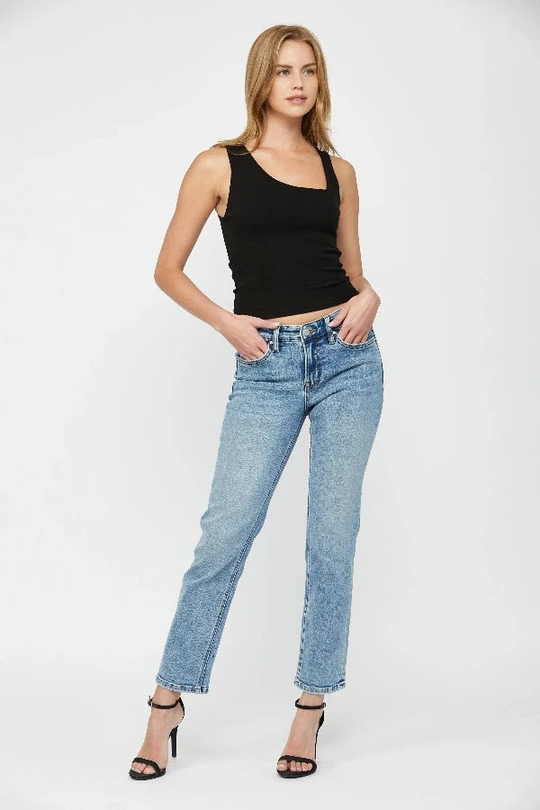 A jean you can't live without! (No, really, we mean it.) Our Mica Mid Rise Straight Leg Jean is the perfect addition to your wardrobe. Made with a light wash, this jean is designed to give you a flattering silhouette with a comfy fit. Get ready to rock your everyday style and take on the world (or at least your daily routine) with confidence and ease.