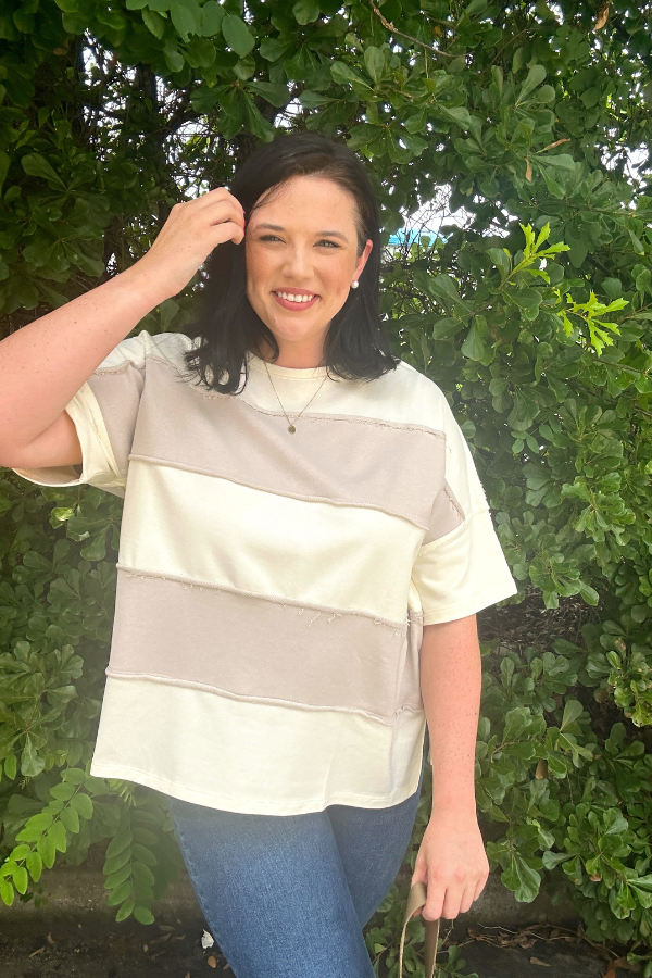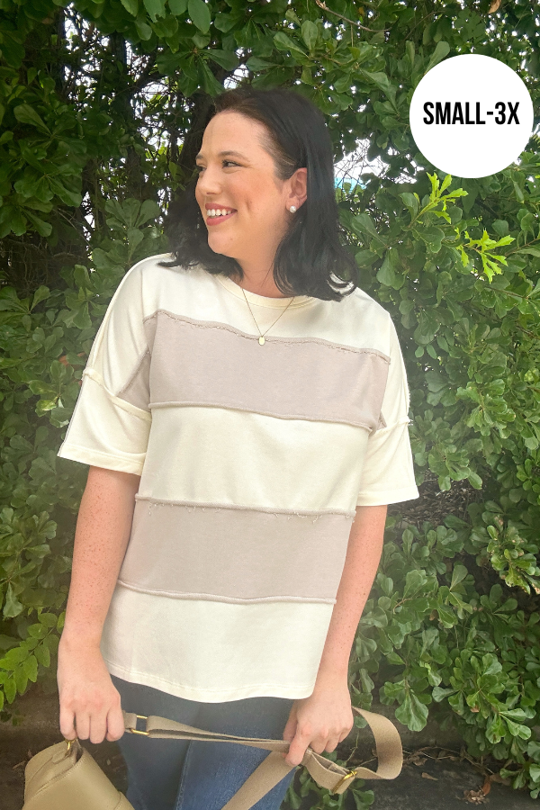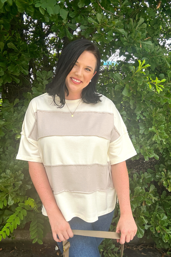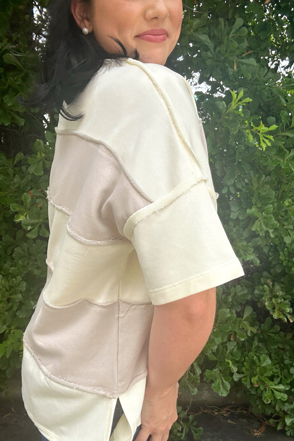 This top features a color block design with raw edge details, crafted from soft French terry knit for a relaxed, casual look.