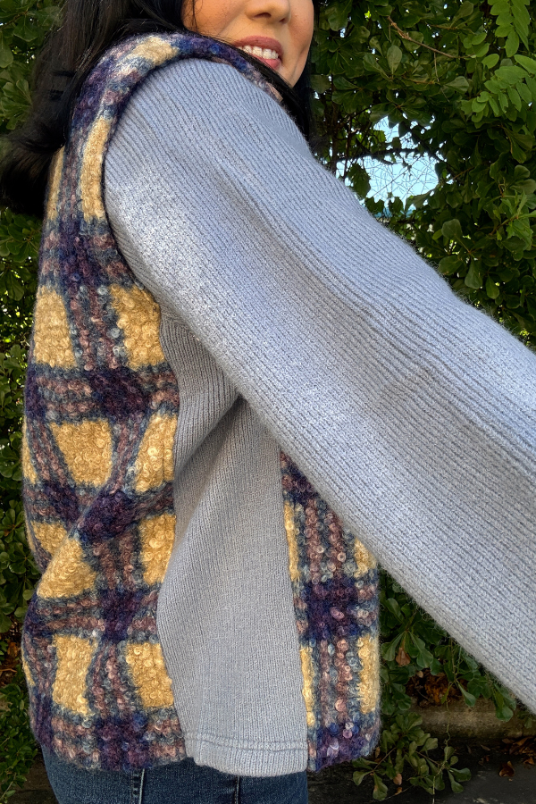 Add a playful twist to your outerwear collection with this cropped jacket, blending soft plaid faux fur with cozy knit sweater sleeves. Designed with a relaxed, boxy fit, it’s perfect for effortless layering. The button-down front and handy pockets bring function to the fashion-forward style, making it a go-to choice for casual days when you still want to stand out.