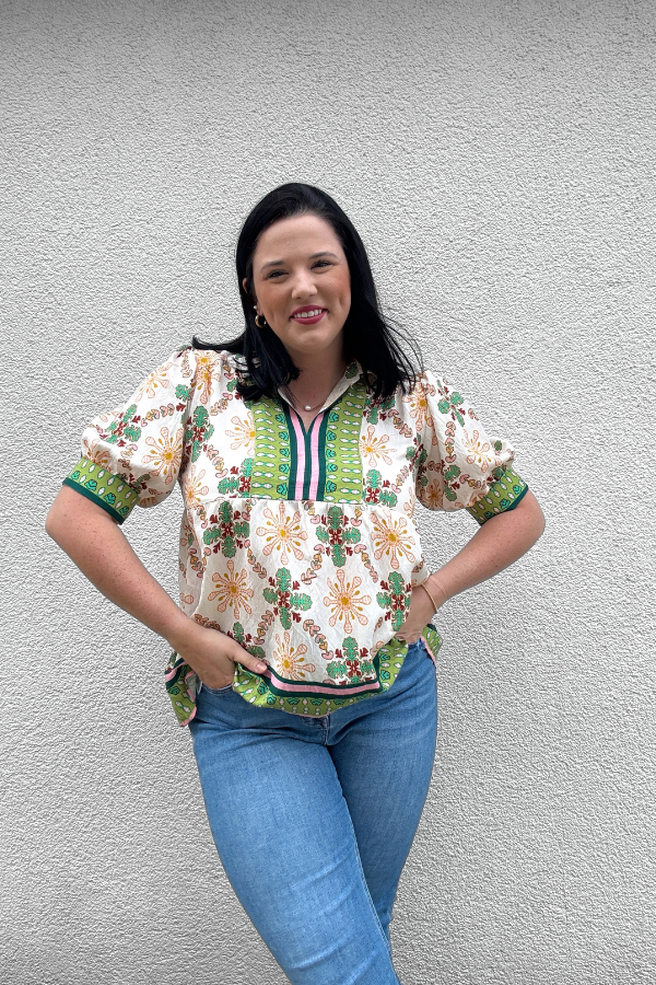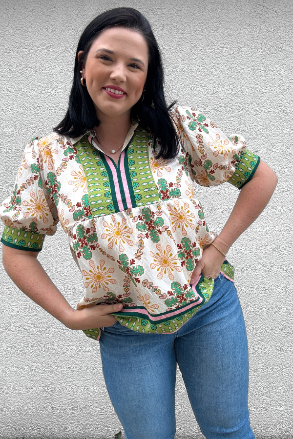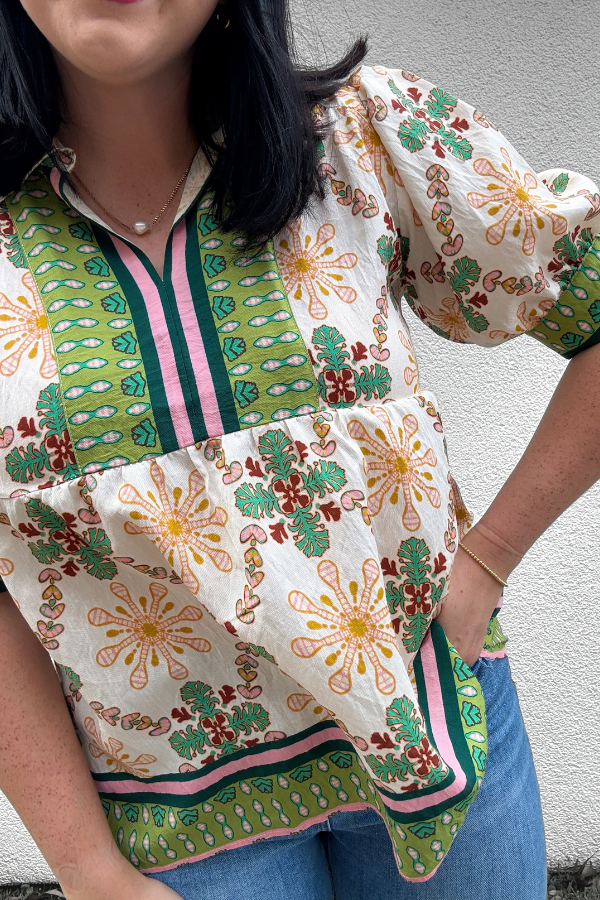 Bright, cheery, and full of detail—this floral border print top brings effortless charm to your everyday style. Designed with short puff sleeves, a split neckline, and a beautifully patterned mix of greens, yellows, and pinks, it’s the kind of statement piece that feels both playful and polished. The relaxed babydoll fit adds an easy, flattering drape that pairs perfectly with denim for a casual day out.