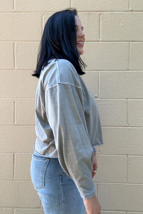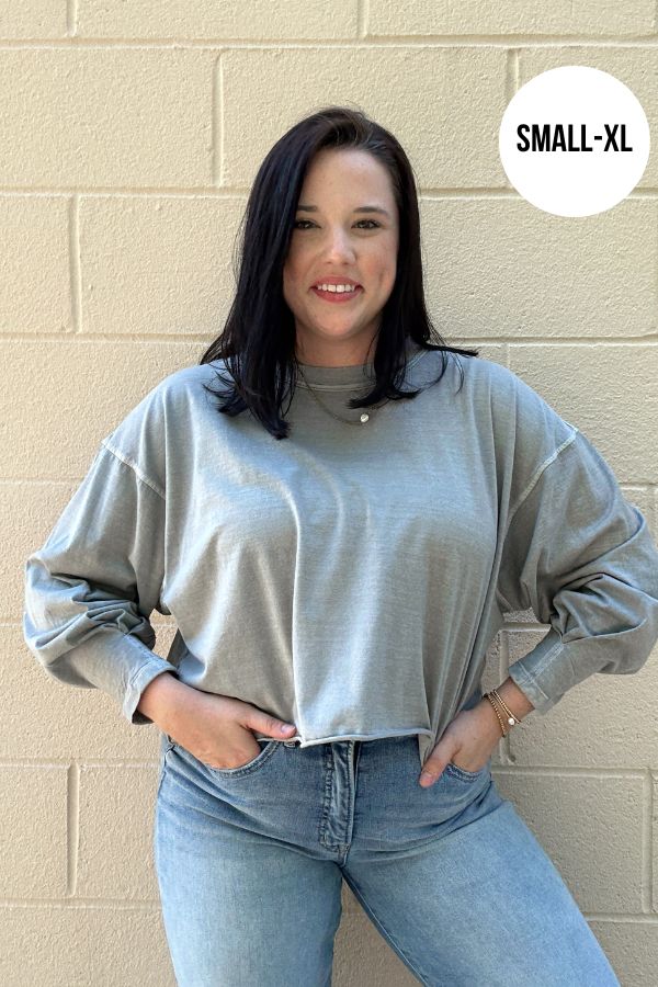 This cropped, round neck long sleeve tee features a pigment dye and enzyme wash for a soft, lived-in feel and unique color.