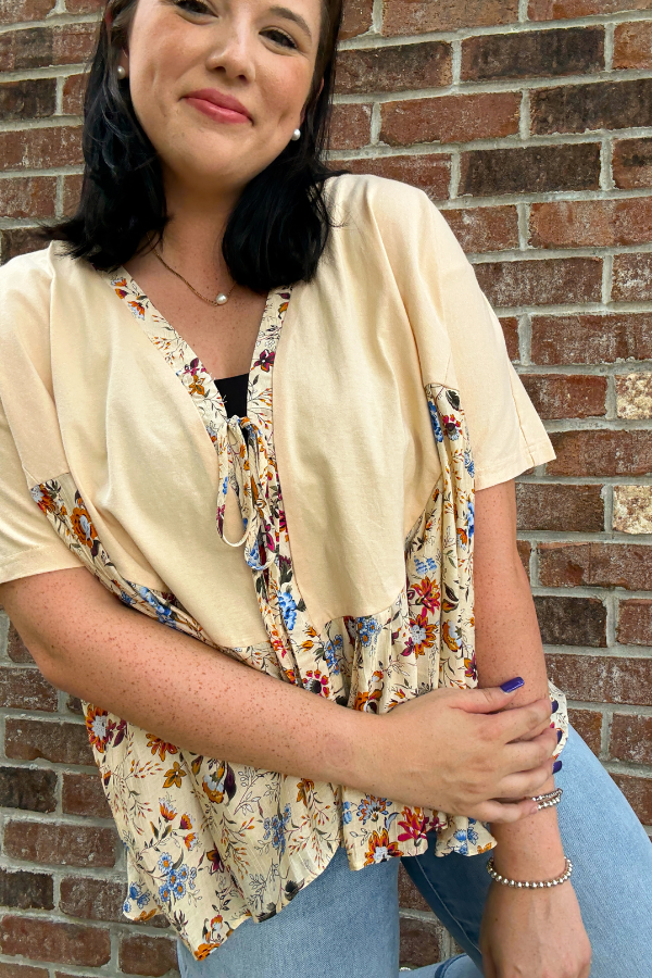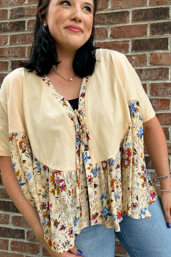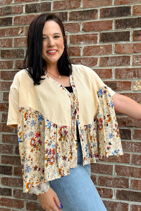 This women's Boho Top features a vibrant multi-floral print that adds a fresh, lively touch to your wardrobe. Designed with short sleeves and a front tie, it offers a relaxed fit reminiscent of a kimono cardigan, perfect for layering over your favorite outfits. Its lightweight fabric makes it ideal for casual outings or warm days, combining comfort with effortless style. Whether paired with jeans or shorts, this top brings a breezy, bohemian vibe to your everyday look.