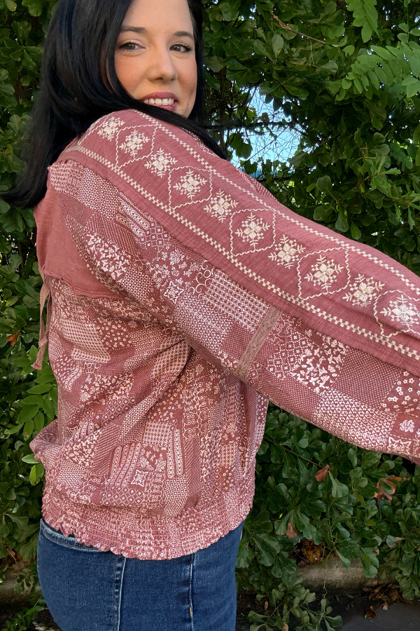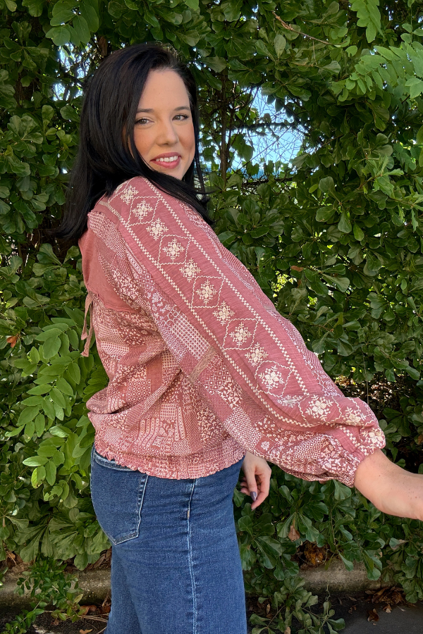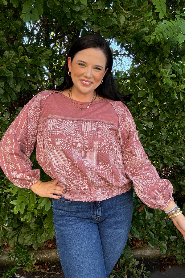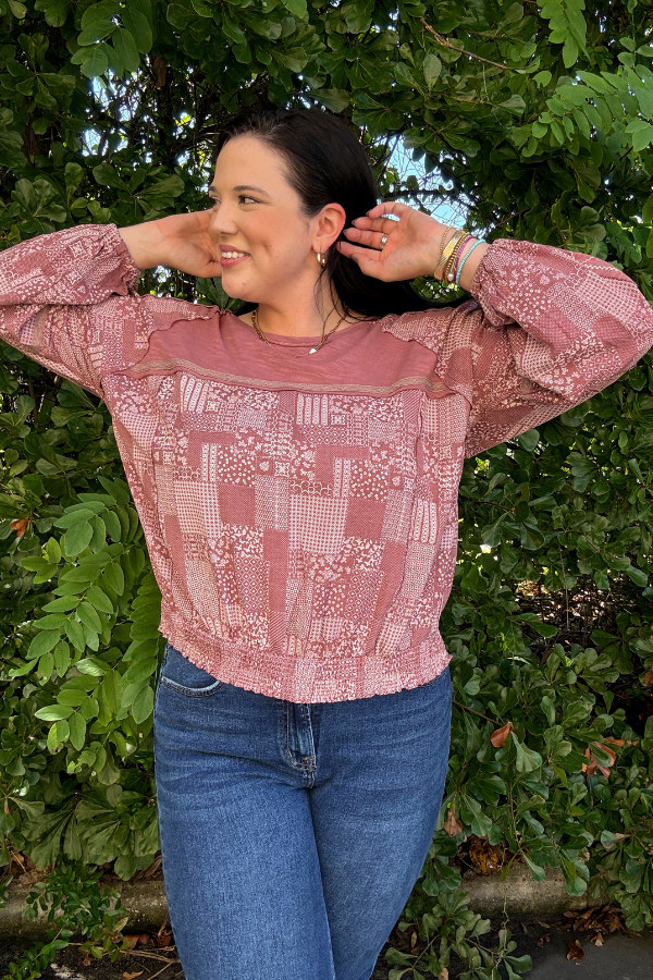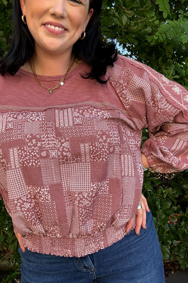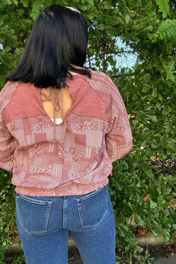 This patchwork print long sleeve top includes a smocked hem at the bottom and a back keyhole detail secured with a lace tie closure.