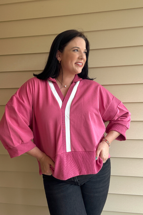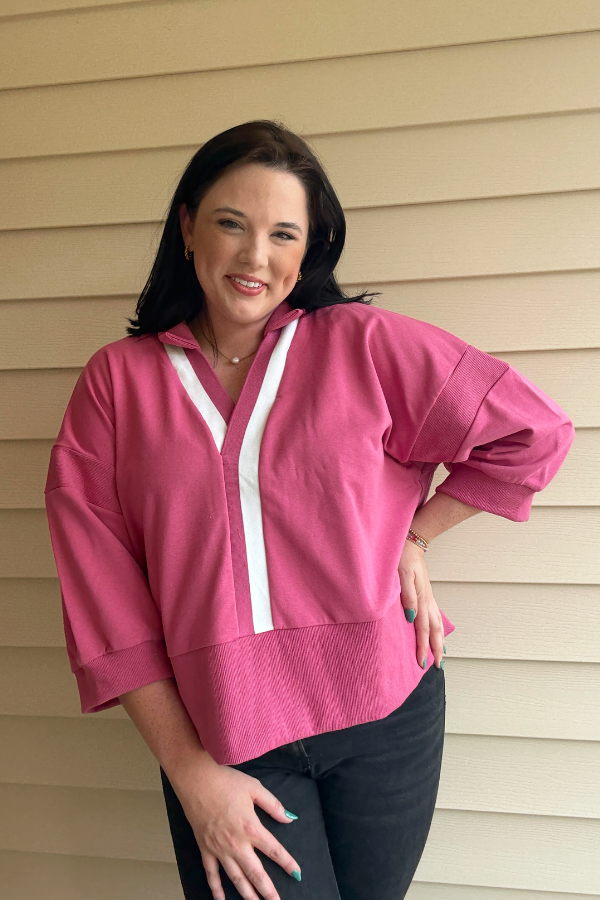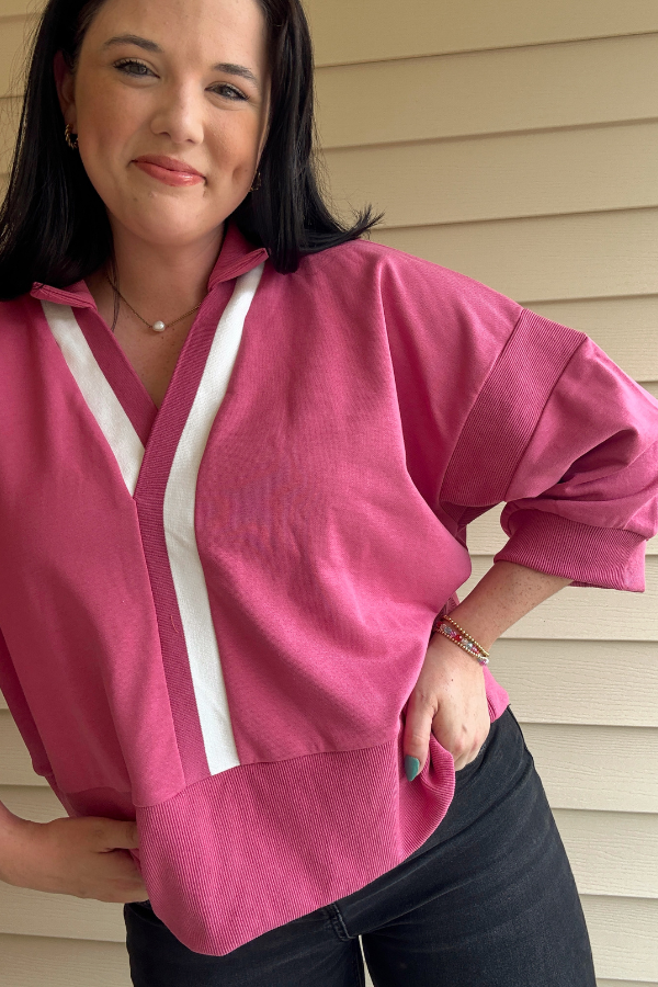 This V-neck collared sweatshirt features contrasting stripe accents and ribbed band details for a sporty, stylish look with cozy comfort.