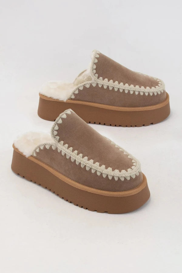 Final sale. Platform Crochet Slides with Faux Suede and Shearling Details - Perfect for Outdoor Activities!