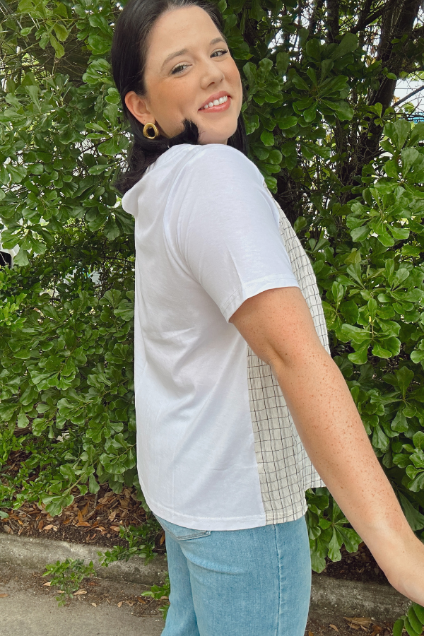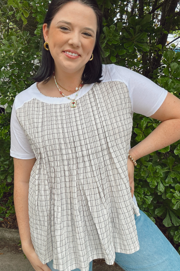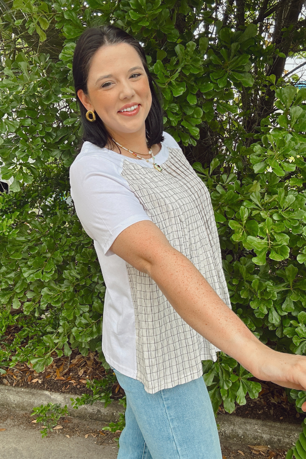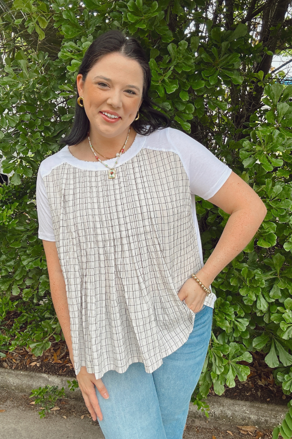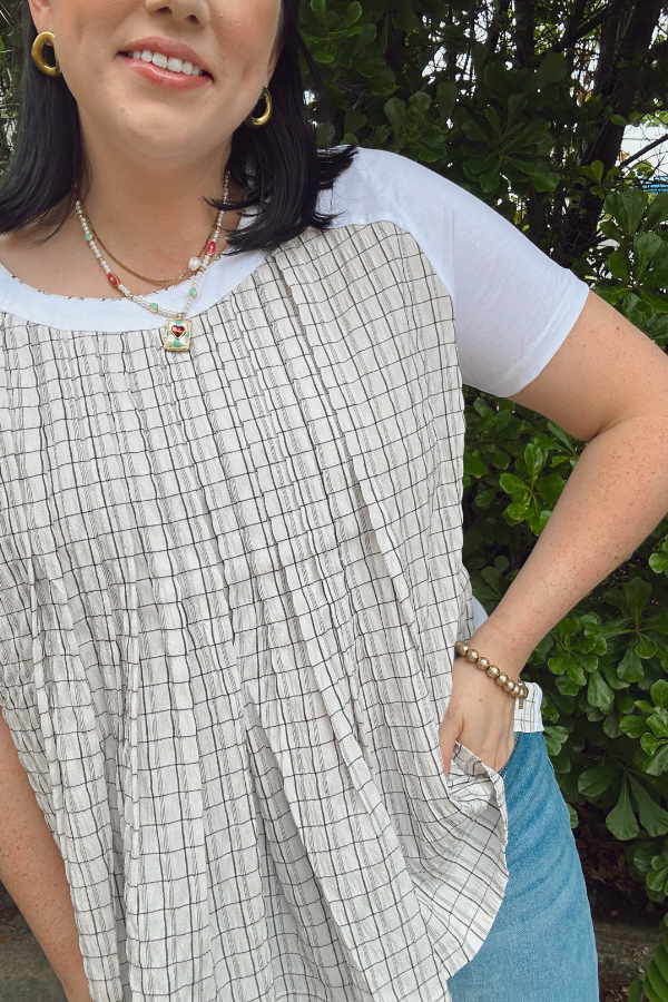 Final sale Mixed Fabric Short Sleeve Top with Pleat Details