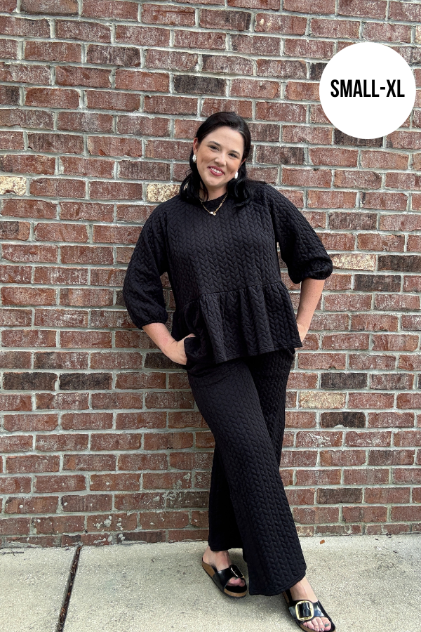 This quilted set pairs a cozy peplum knit top with wide-leg pants for an effortlessly stylish look. The wide-leg pants come with an elastic waistband for comfort and easy movement, while the loose fit throughout ensures you stay relaxed all day long. Crafted from soft quilted knit fabric, this set is perfect for lounging or running errands in laid-back comfort without sacrificing style.