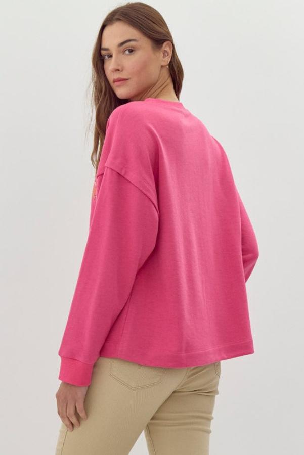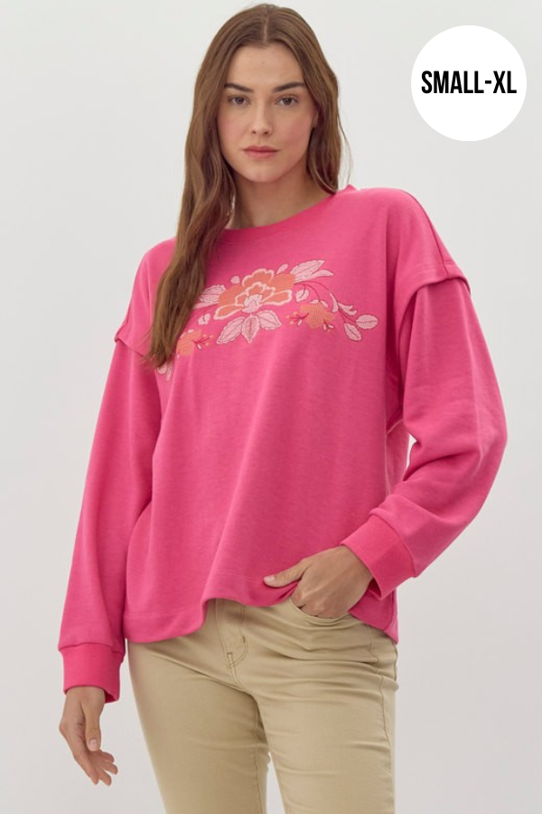 No iron-on designs here! Featuring a floral embroidery design on the front, drop shoulders and ribbing on the sleeves.