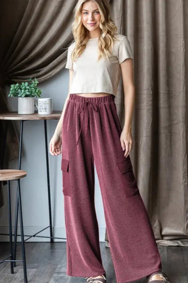 These casual ribbed pants in a solid burgundy shade feature an elastic waistband, side pockets, and a drawstring for a comfortable, relaxed fit. Perfect for both lounging around and running errands