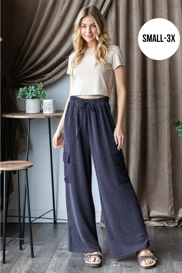 Casual solid navy ribbed pants featuring an elastic waistband, side pockets, and a drawstring for an adjustable fit. Perfect for both lounging around and running errands!