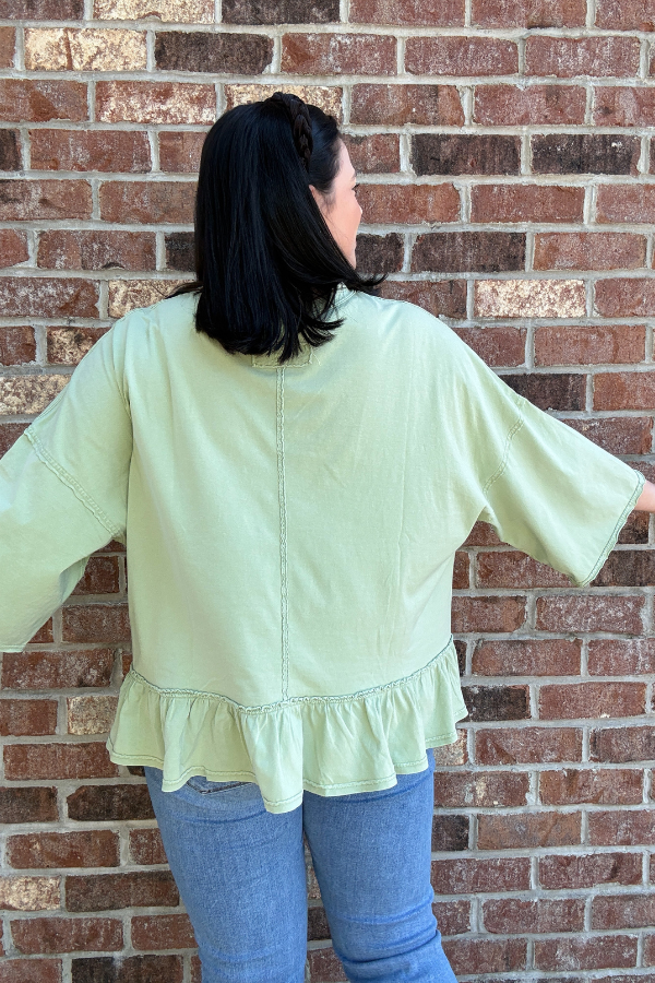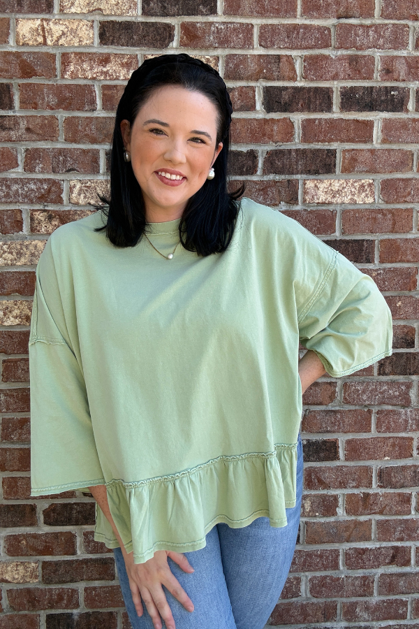 This soft, lightweight top features a relaxed fit with a subtle drop shoulder and a flowy ruffle hem for an easy, flattering silhouette. Perfect for everyday wear, it pairs effortlessly with denim and can be dressed up or down for a laid-back, comfortable look.