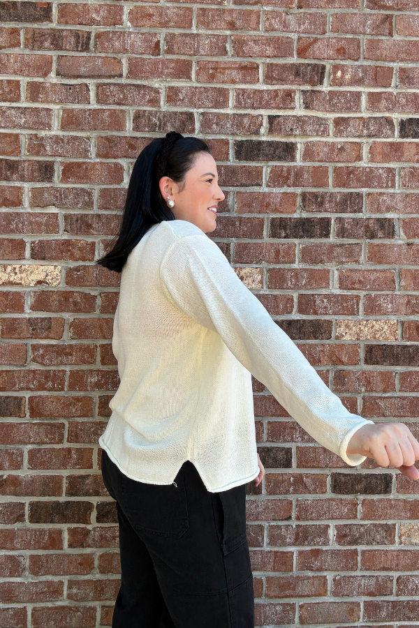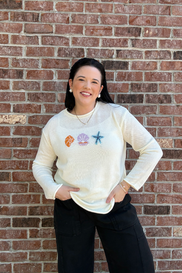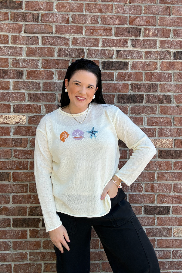 This lightweight knit sweater features a relaxed, easy fit with long sleeves and a soft, breathable feel. Finished with playful coastal-inspired icons across the front, it’s an effortless everyday layer that pairs perfectly with denim for laid-back, beachy vibes.