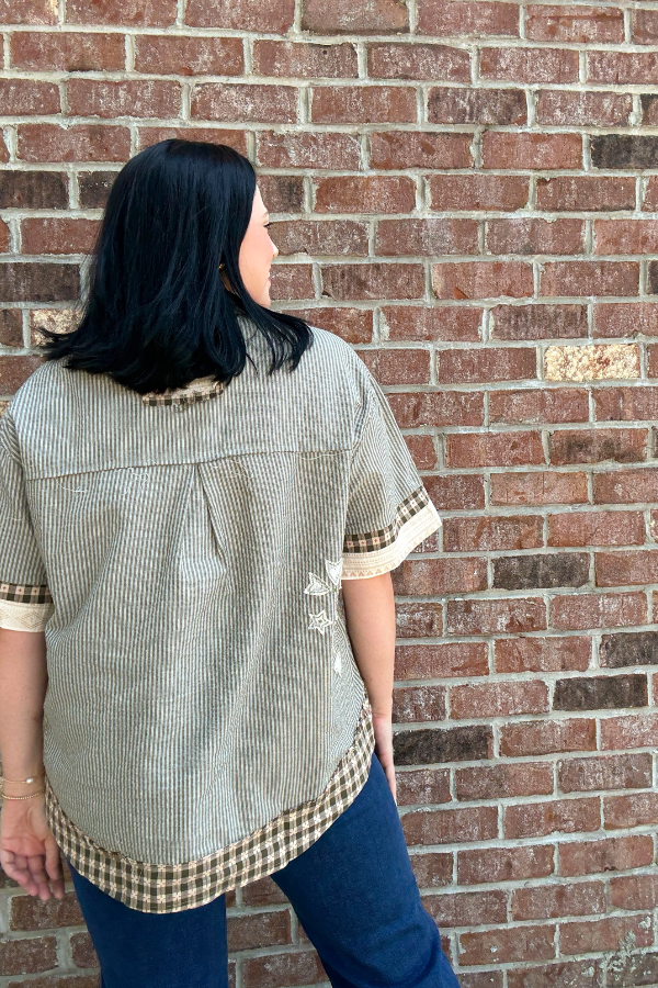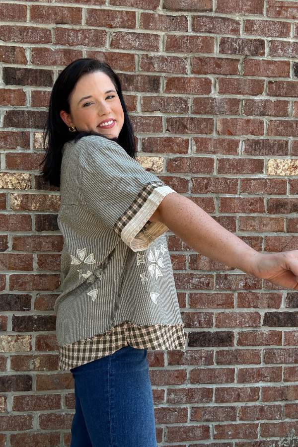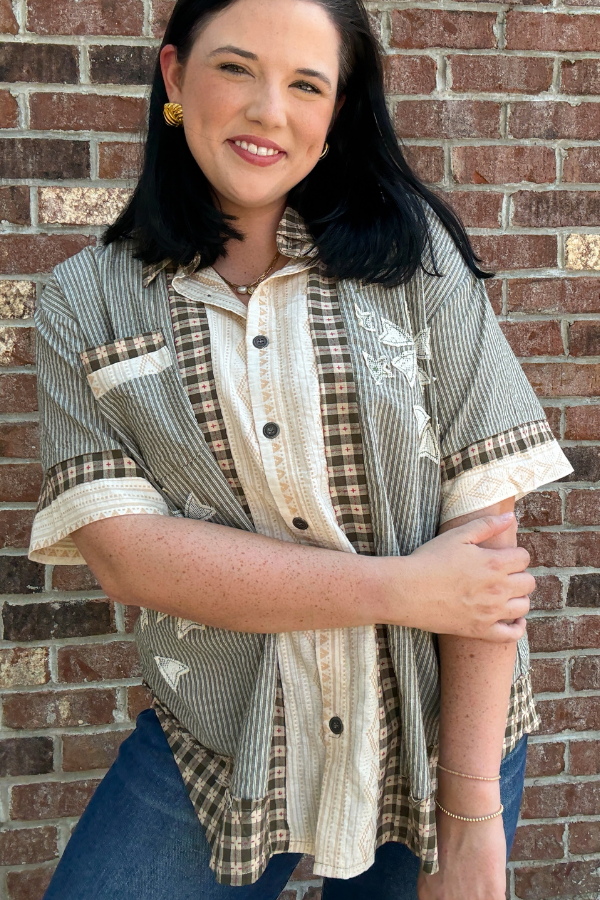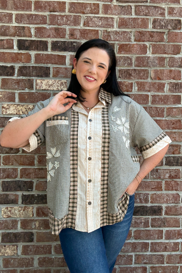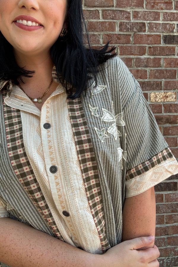 Designed in short sleeve roomy fit shirt in printed woven with varied textured and printed woven patchwork, a chest and side patch pocket, floral patch accents, and a back pleat detail.