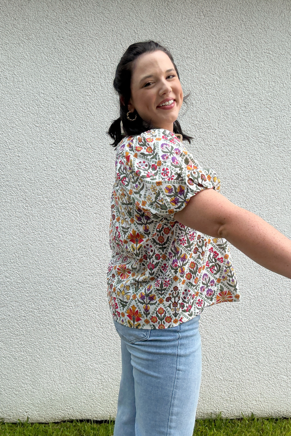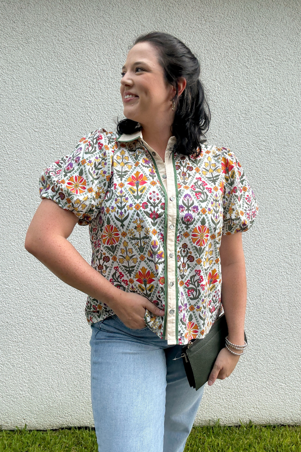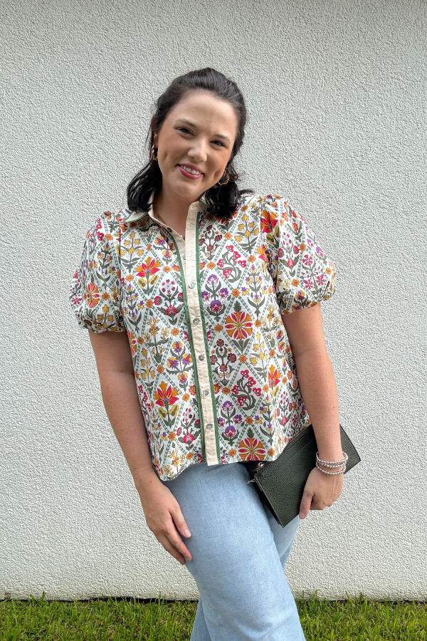 This short-sleeved blouse features a vibrant fall floral pattern paired with a standout contrasting collar for a fresh, casual look.