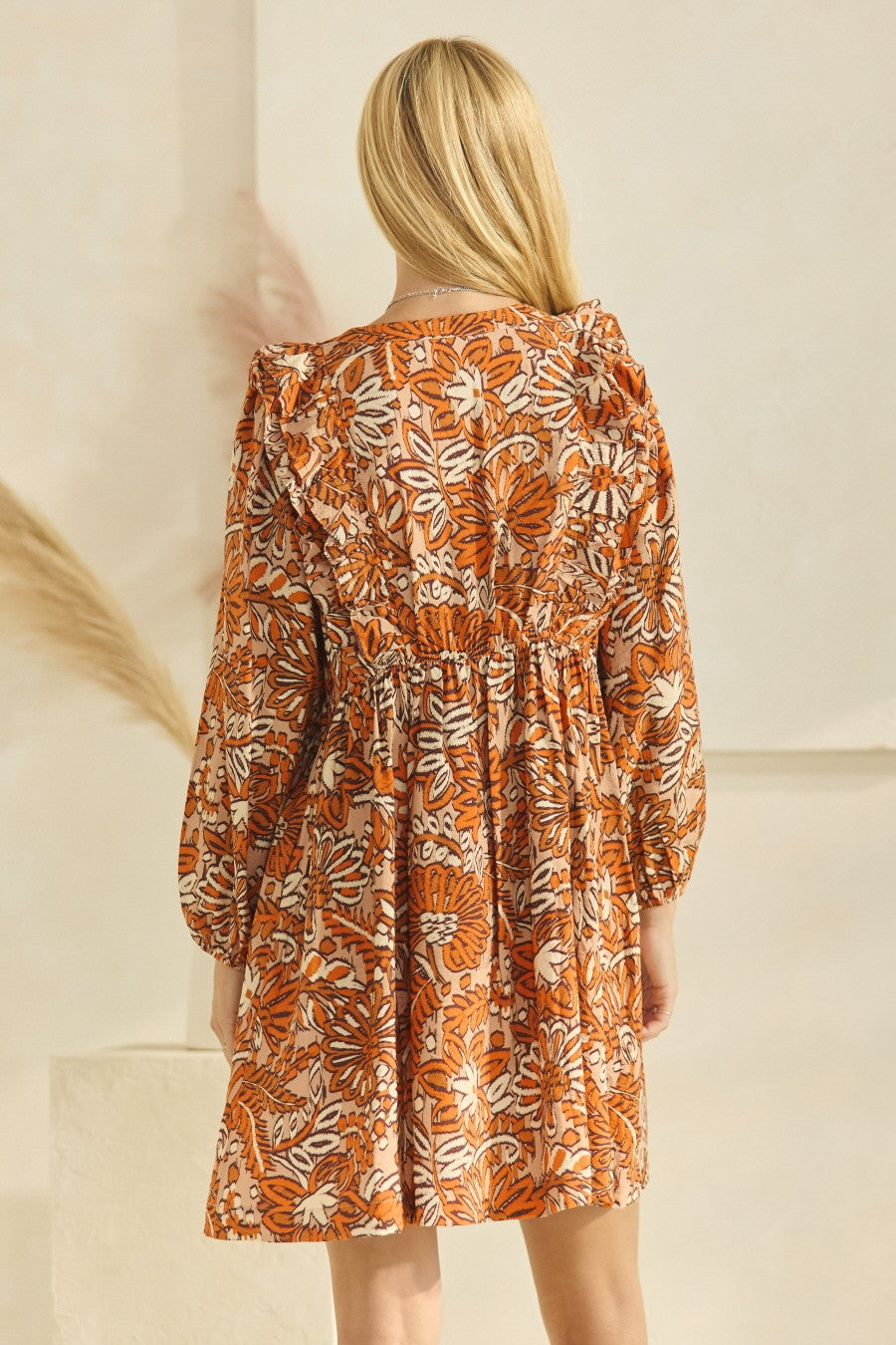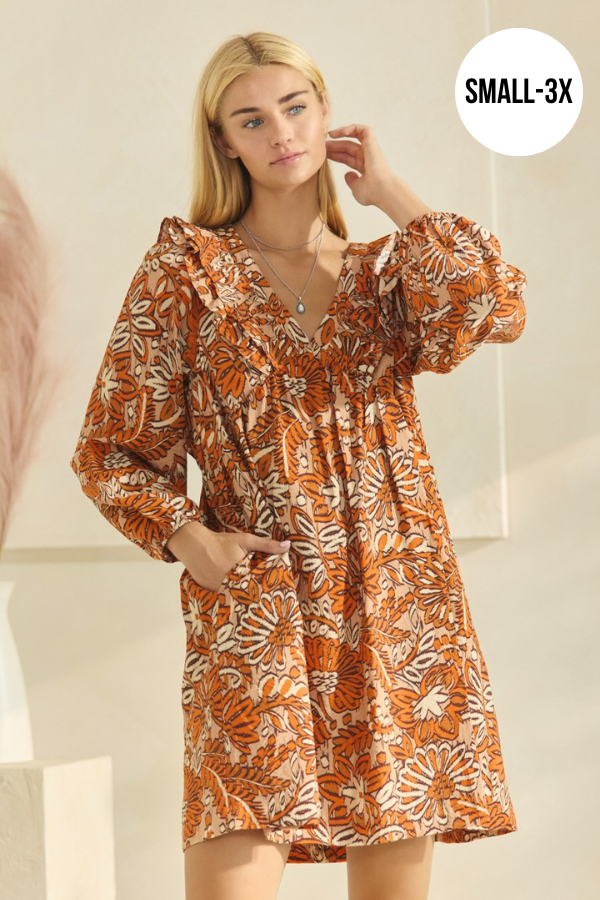 This floral printed V-neck mini dress is the perfect blend of style and comfort. Featuring long sleeves and a flattering V-neckline, it’s designed with a playful floral print that adds a touch of charm to any occasion. The mini length keeps it fun and flirty, while the hidden side pockets bring a functional, laid-back vibe. Ideal for dressing up or down, this versatile piece is your go-to for effortless style with a hint of practicality
