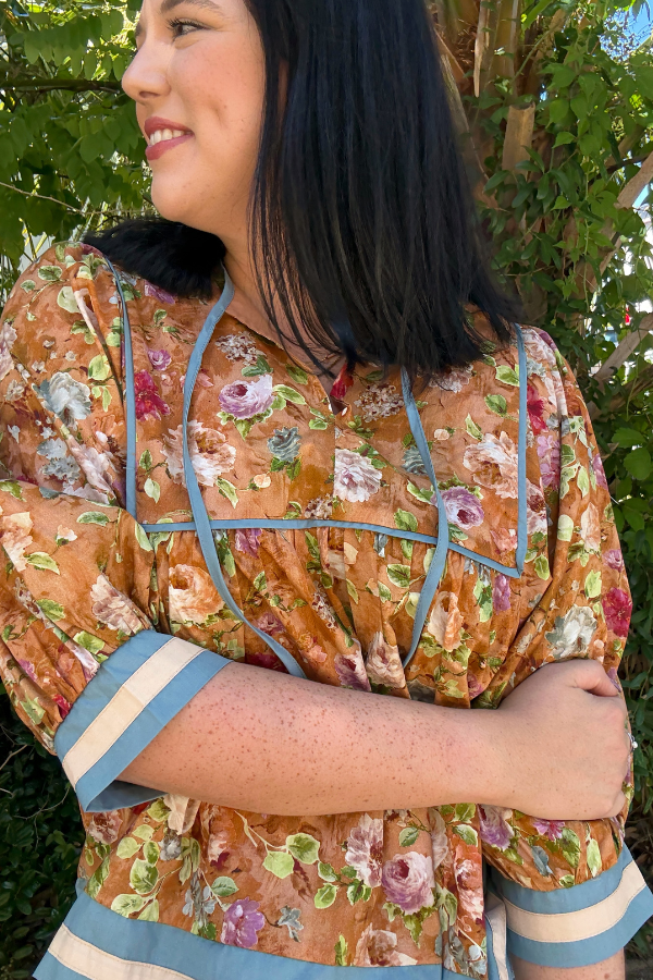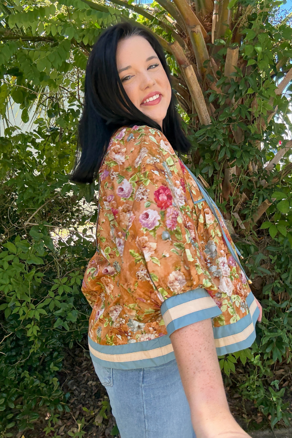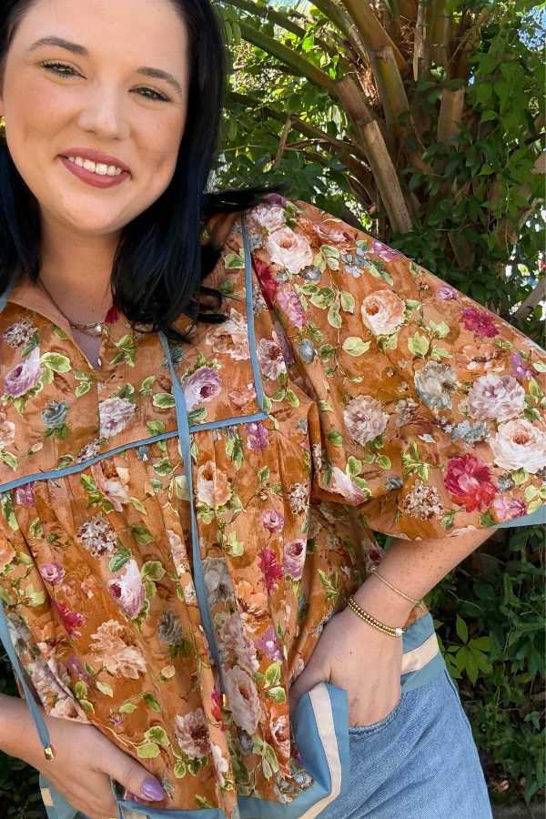This loose, vintage-inspired top features ¾ sleeves and an empire waist with a multicolor accent band. Made from lightweight woven fabric, it is unlined and not see-through, perfect for casual wear.