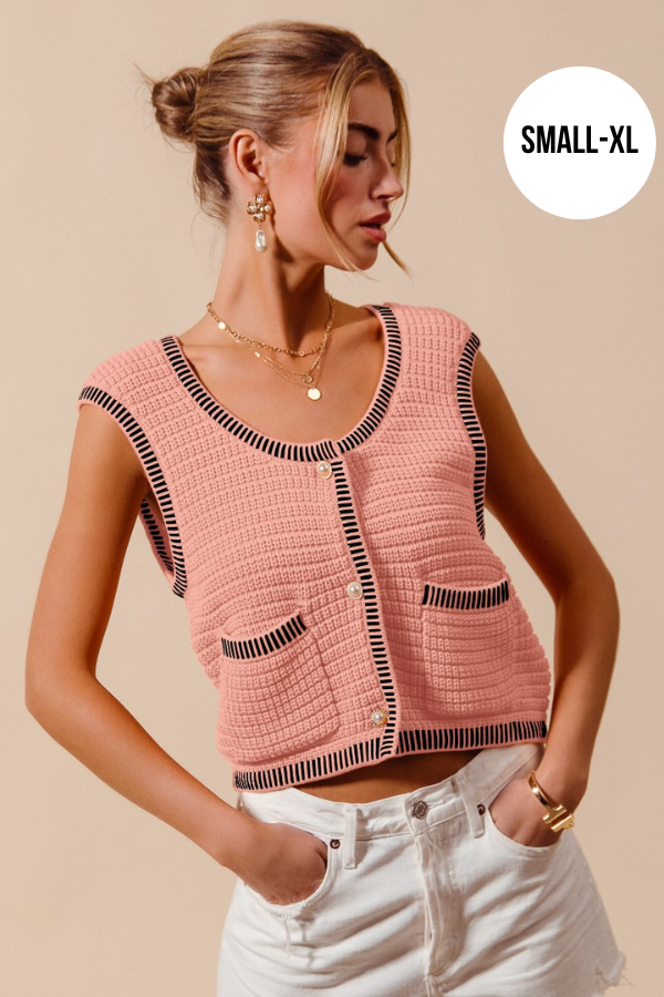 Final sale. This textured sweater vest top combines cozy comfort with stylish details. Featuring practical pockets, contrast stitching that adds a subtle pop, and elegant pearl buttons, it’s perfect for layering or wearing on its own. Its unique texture gives a fresh twist to a classic piece, making it an easy choice for casual outings or relaxed office days. Pair it with jeans or skirts for a versatile look that’s both comfortable and chic.