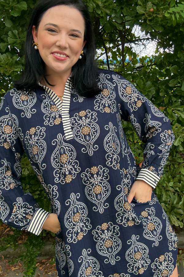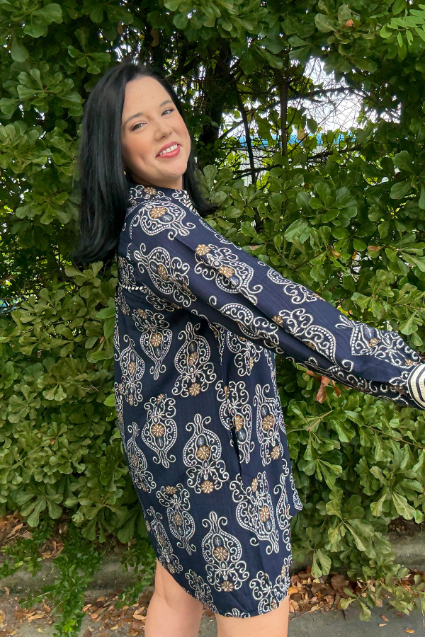 The That's The Point Dress is a stylish long sleeve woven mini dress featuring a distinctive printed pattern that adds a playful touch to your wardrobe. Designed with a contrasting detail, it brings an extra dimension of style and uniqueness to the look. Practical and chic, this dress includes pockets, making it perfect for carrying your essentials hands-free. Comfortable and easy to wear, it’s ideal for casual outings or relaxed days when you want to feel effortlessly put together.