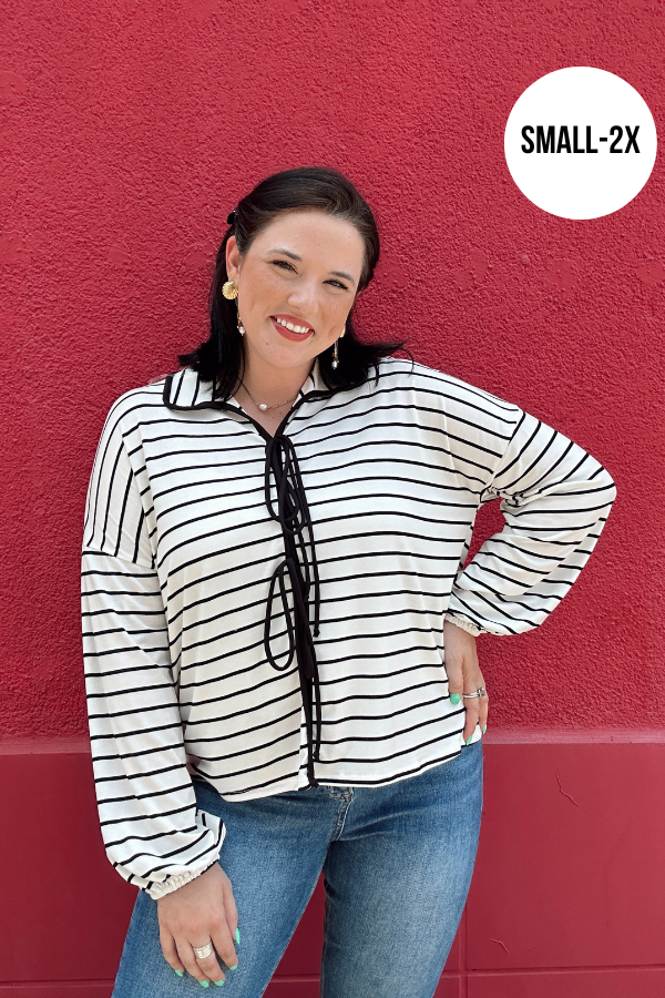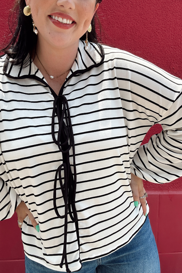 Featuring contrast black trim, playful front tie details, and flowy sleeves, it adds a fun twist to classic stripes. The lightweight, relaxed fit makes it perfect for everyday wear with just the right touch of flair.