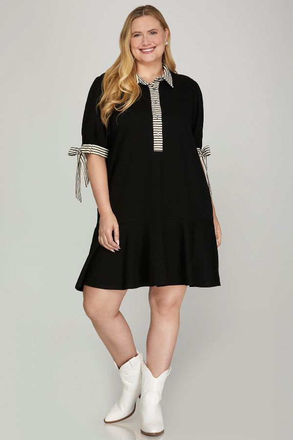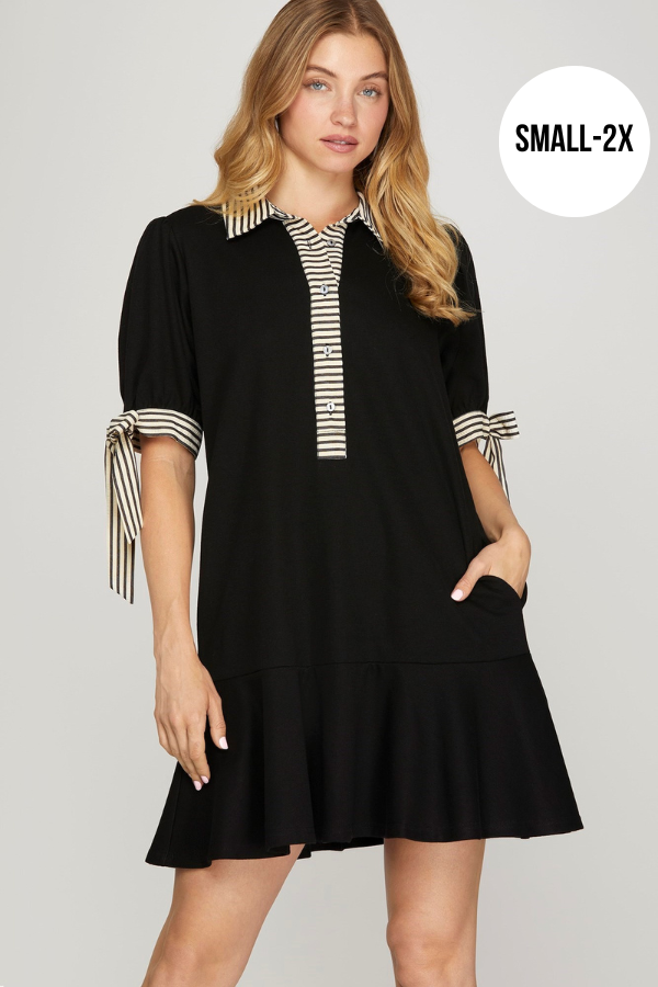 This casual knit mini dress features tied sleeves, a half-button front, and convenient pockets for everyday comfort and style. Wear it to work, out to brunch or in the classroom! This dress can be work year round!