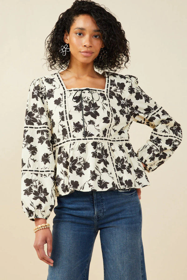 The Tied Together Top is a charming addition to your casual wardrobe, crafted from soft floral print fabric that brings a fresh, feminine vibe. Its distinctive square cut neckline highlights your collarbone while adding a touch of elegance, and the delicate lace and ribbon trim enhance the top's subtle details. Designed with a flattering peplum silhouette, this top gently flares at the waist, creating a comfortable fit that moves with you. Perfect for pairing with your favorite jeans or skirts, it effortlessly combines style and comfort for everyday wear.